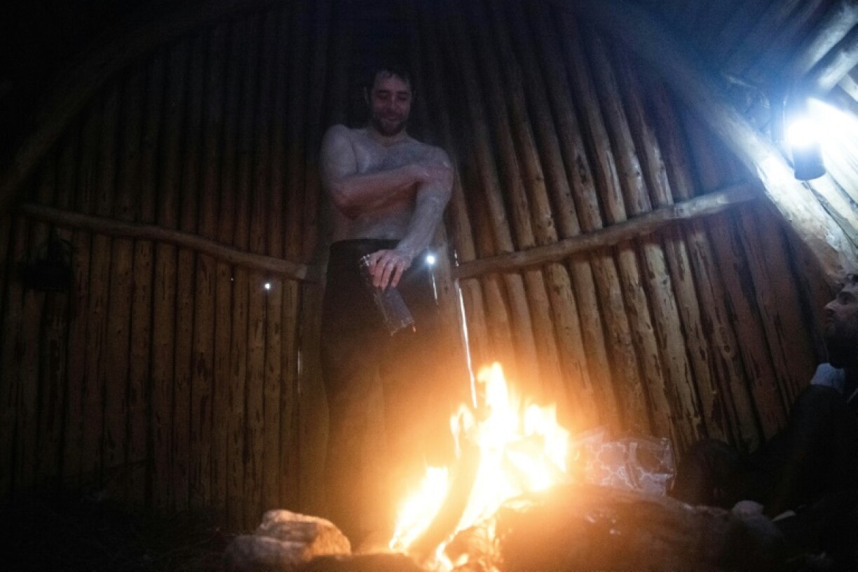 De Guérin-Boëri wiermt sech mat engem waarme Feier am Virfeld op seng kal Tauchgäng, dat an enger traditioneller norwegescher Hütt aus Holz, déi mat Buedem a Wiss bedeckt ass.