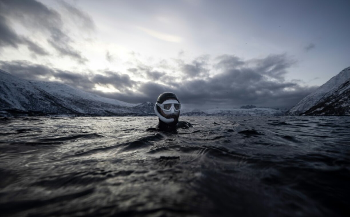 Mat engem déiwen Otemzuch taucht de Fransous iwwer 15 Meter déif am äisege Waasser vun de Kvaenangen-Fjorden, fir do déi imposant Walfësch ze beobachten, déi do no Hierke joen. “Ech sinn am Waasser direkt nieft zwee Super-Predateuren getaucht, déi mech acceptéieren. Et ass majestéitesch”, sou den 38 Jore alen Taucher no der éischter Kéier am Waasser mat dësen Déieren.