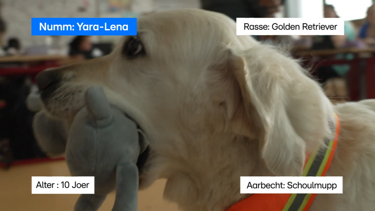 Mam Yara-Lena maache souguer franséisch Conjugaisounen a Rechenaufgabe Spaass. D’Yara-Lena ass eng 10 Joer Golden-Retriever-Madamm a begleet seng Meeschtesch, d’Claudia Rosa, ee Mol d’Woch fir zwou Stonnen an d’Primärschoul “Scheierhaff” zu Zolwer. 20 bis 40 Minutte gëtt d’Yara-Lena aktiv an de Kuer mat agebonnen an hëlt u verschiddenen Exercicer deel. De Rescht vun der Zäit geet et sech Kuschelunitéite sichen oder schléift.