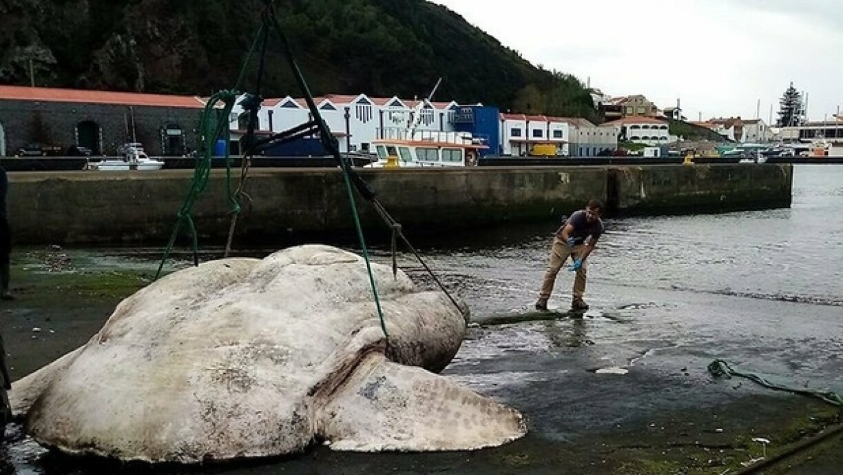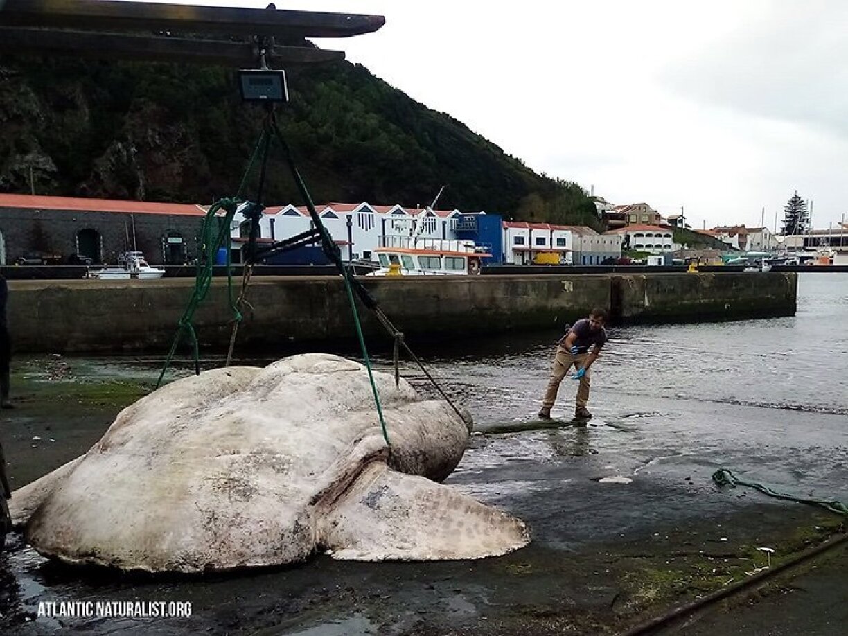6.000 Pond weit de Fësch, dat entsprécht méi wéi 2.700 Kilo a méi genee bal 3 Tonnen. Am Dezember 2021 hate Fëscher den doudege Koloss am Nordatlantik dreiwe gesinn.
