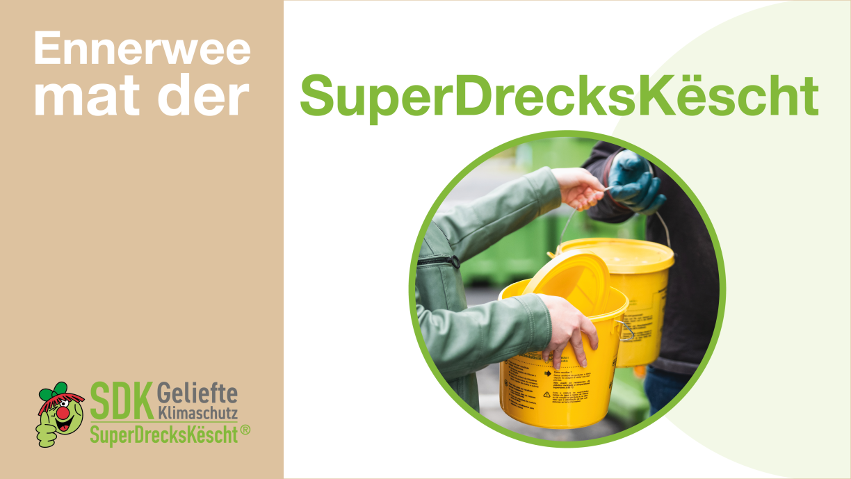 Kach-Ueleg däerf ni an de Lavabo oder an d’Toilette geschott ginn. Dofir huet SuperDrecksKëscht eng besser Léisung: eise giele Frittefett-Eemer. Dëse kritt ee gratis bei der mobiller Sammlung oder am Ressourcencenter. Nodeems d’Fett ofgekillt ass, kann een et an dësem Behälter sammelen a bei der Mobiller Sammlung oder am Ressourcencenter ofginn. Och fir d’Gastronomie ginn et des Eemeren an do kann en se och iwwert eis Entsuergen.