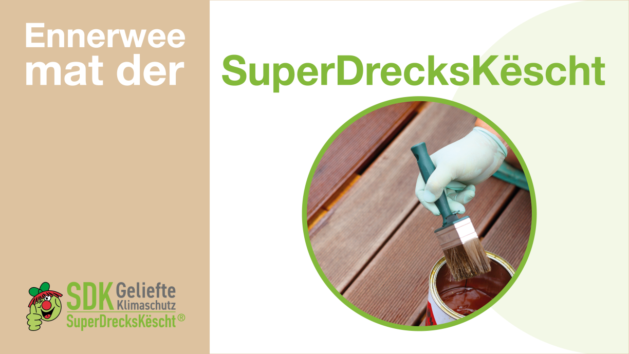 Holz gëtt dobaussen an dobannen héich belaascht duerch Wieder, Fiichtegkeet, Insekten oder Verschmotzung. Dofir gräifen vill Leit op Holzschutzmëttel zeréck. Mee wat genee sinn dës Produiten? D’Chiara Wohl vun der SuperDrecksKëscht erkläert dem Nico Thielen am Interview, datt Holzschutzmëttel virun allem dozou déngen, déi baussenzeg Schicht vum Holz ze schützen an d’Material méi laang haltbar ze maachen. Se hëllefen och dobäi, en eventuelle Befall ze vermeiden oder existent Schied ze bekämpfen – dacks a Form vu Lasuren, Ueleger oder Wues.