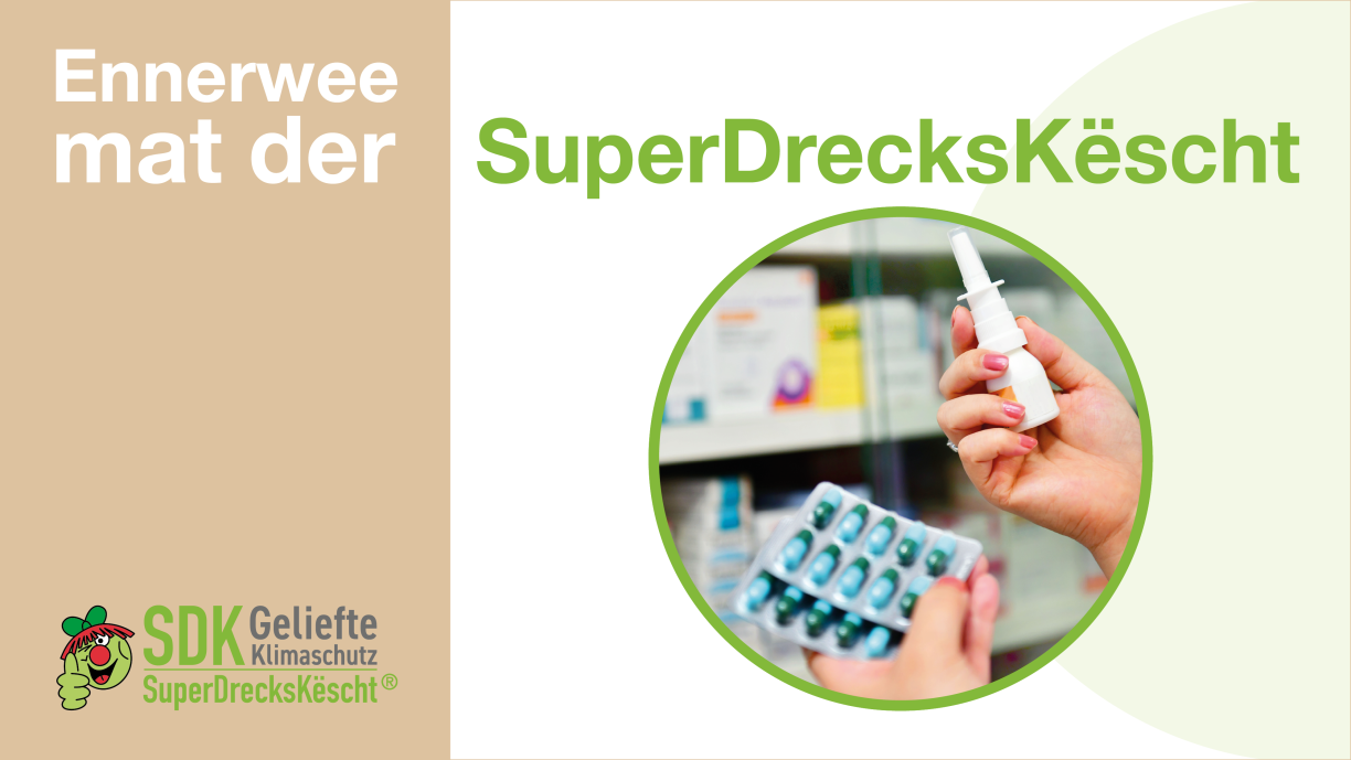 Wierkstoffer, déi a Medikamenter enthale sinn, kënne bei falscher Entsuergung dem Mënsch an der Ëmwelt schiedegen. Dofir soll een se op kee Fall iwwert de Lavabo, d’Toilette oder déi schwaarz Poubelle entsuergen.