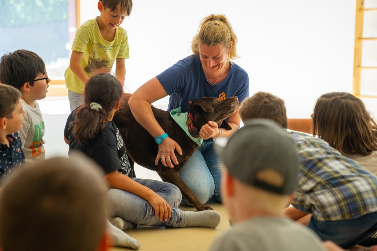 Den Aufgabeberäich vun engem Schoulhond ass breetgefächert, vu Virliese bis hin zu Wierfelspiller kann d’Fellnues a villen Hisiichten aktiv an den Unterrecht mat agebonne ginn. Fir d’Chantal war et wichteg, déi emotional a sozial Kompetenze vun de Kanner ze trainéieren, un hirer Onsécherheet ze schaffen an e bessert Klasseklima hierzestellen. Dofir huet d’Enseignante decidéiert, fir mam Schoulhond esou ze schaffen, dass Kanner mat him zesummen Übunge maachen. D’Chantal mécht d’Übungen eng Kéier vir, dann ass et un de Kanner, fir Kommandoe wéi “Patt” oder “Bleif” mat der Fellnues ze trainéieren. Si huet sech bewosst dofir entscheet, “well et ass extrem schéin, fir d’Entwécklung vun de Kanner ze gesinn an dat Selbstbewosstsinn, dat si einfach op eemol hunn. (...) Si sinn och selwer iwwert sech erstaunt, wa si da gesinn, OK, hatt mécht elo wierklech dat, wat ech gär gehat hätt! Dat ass meng Leeschtung!”