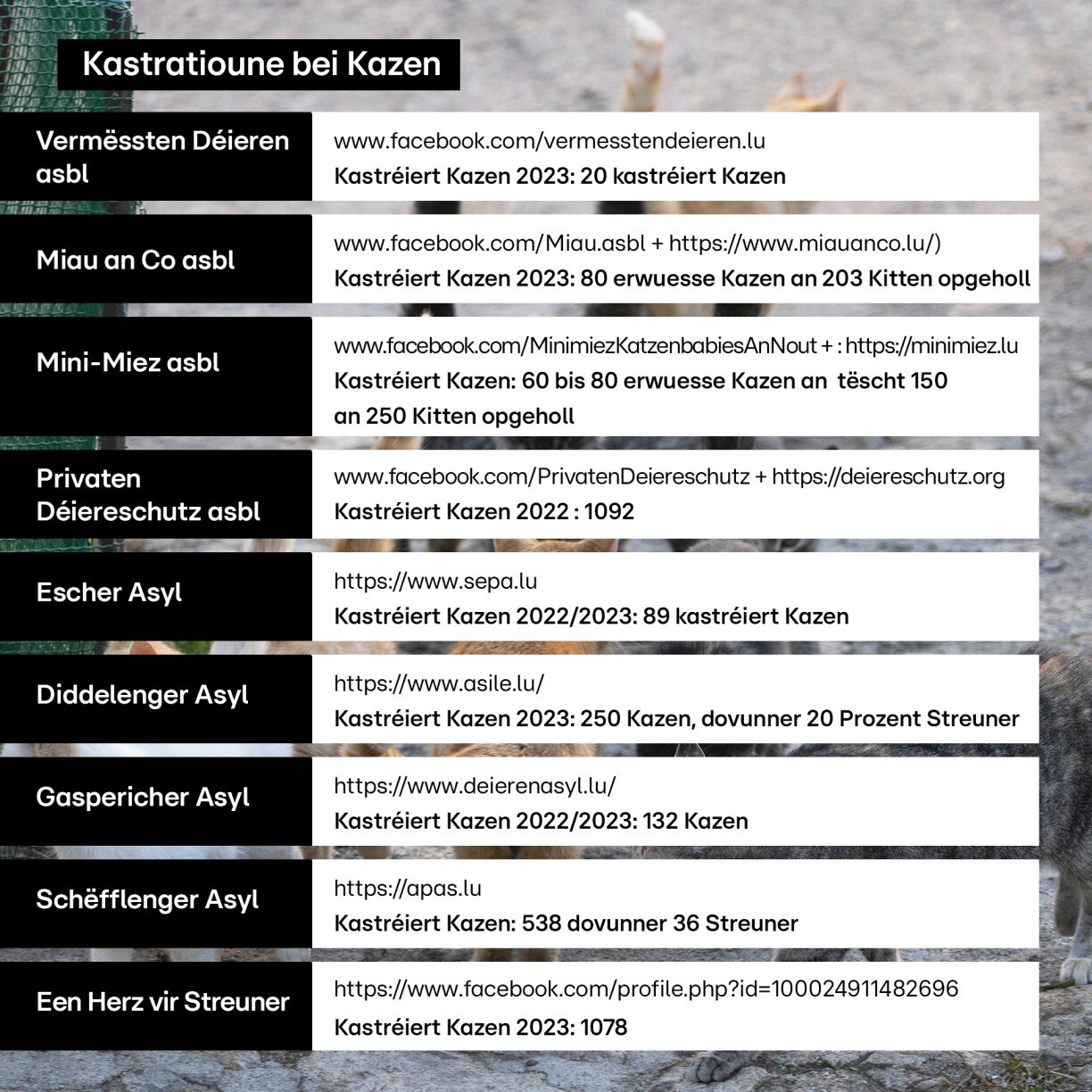 2023 konnte si esou 1.078 Kazen hëllefen. 781 Kaze si steriliséiert, gechippt, géint Parasitte behandelt an zréck op hir Fudderplaz komm. 288 weider Kaze waren ze kleng, ze krank, ze mënschebezunn a si weider vermëttelt ginn.