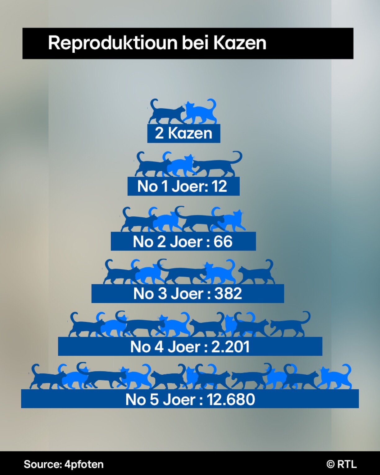 Eng Kaz kann zweemol d’Joer Jonker kréien an ass vun engem hallwe Joer u geschlechtsräif. Ee Worf sinn am Duerchschnëtt 2 bis 3 Kitten. Déiereschutzorganisatioune wéi “Vier Pfoten” oder “Peta” maachen d’Rechnung.