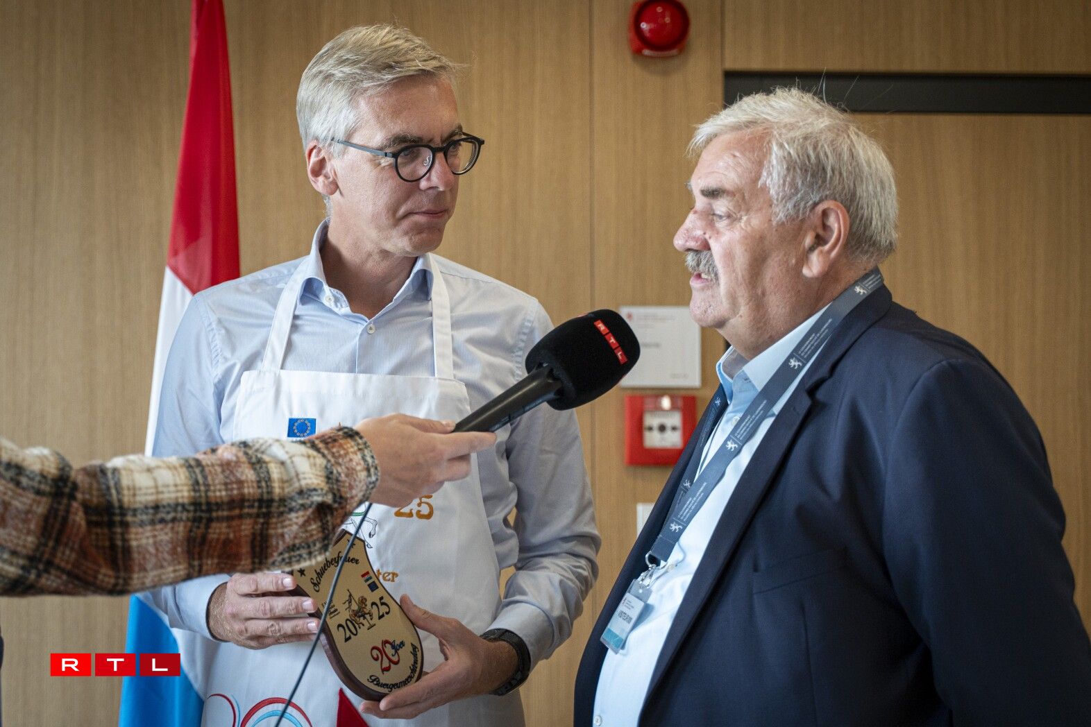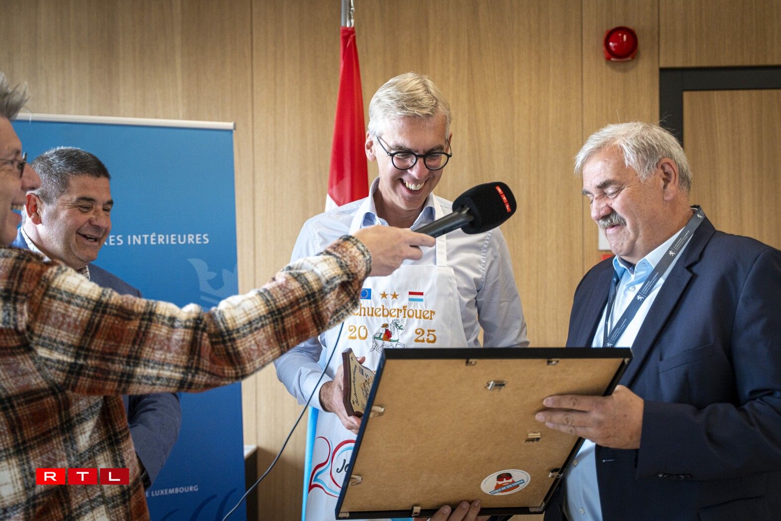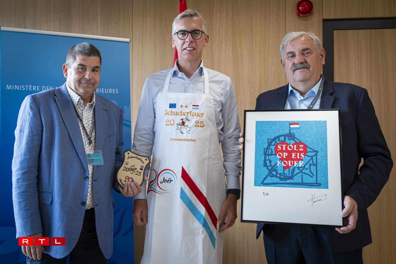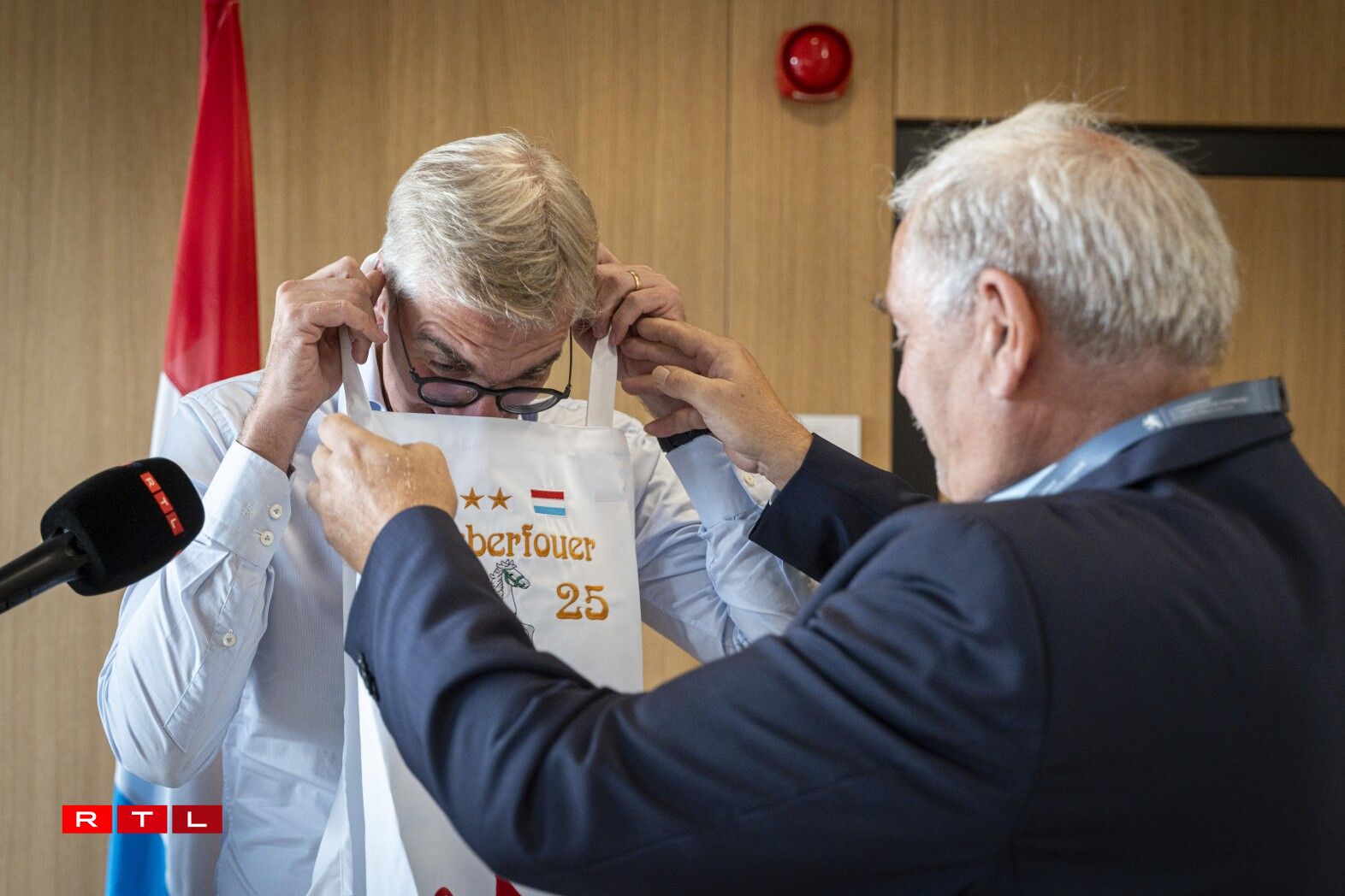 Dowéinst sinn en Donneschdeg de Moien de President Charel Hary a säi Sekretär Gilbert Legil bei hien an de Ministère gaangen, fir him dat schéint Schiertech, e Souvenir fir 20 Joer Buergermeeschterdag an e Bild mam Logo 'Ech sinn stolz op eis Fouer' z'iwwerreechen