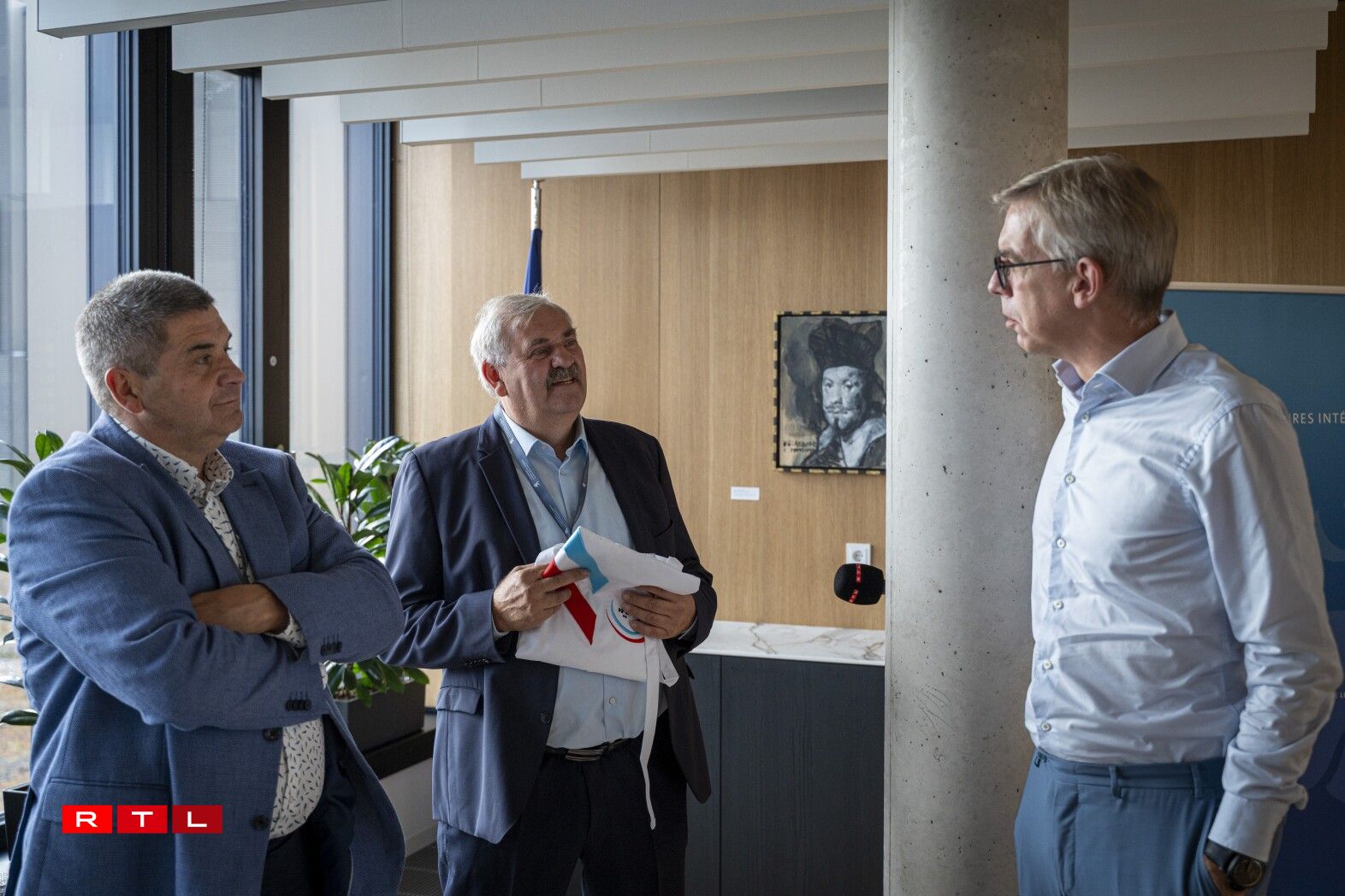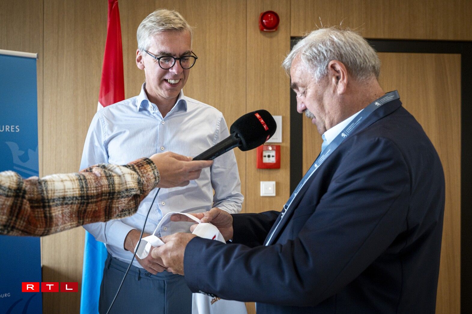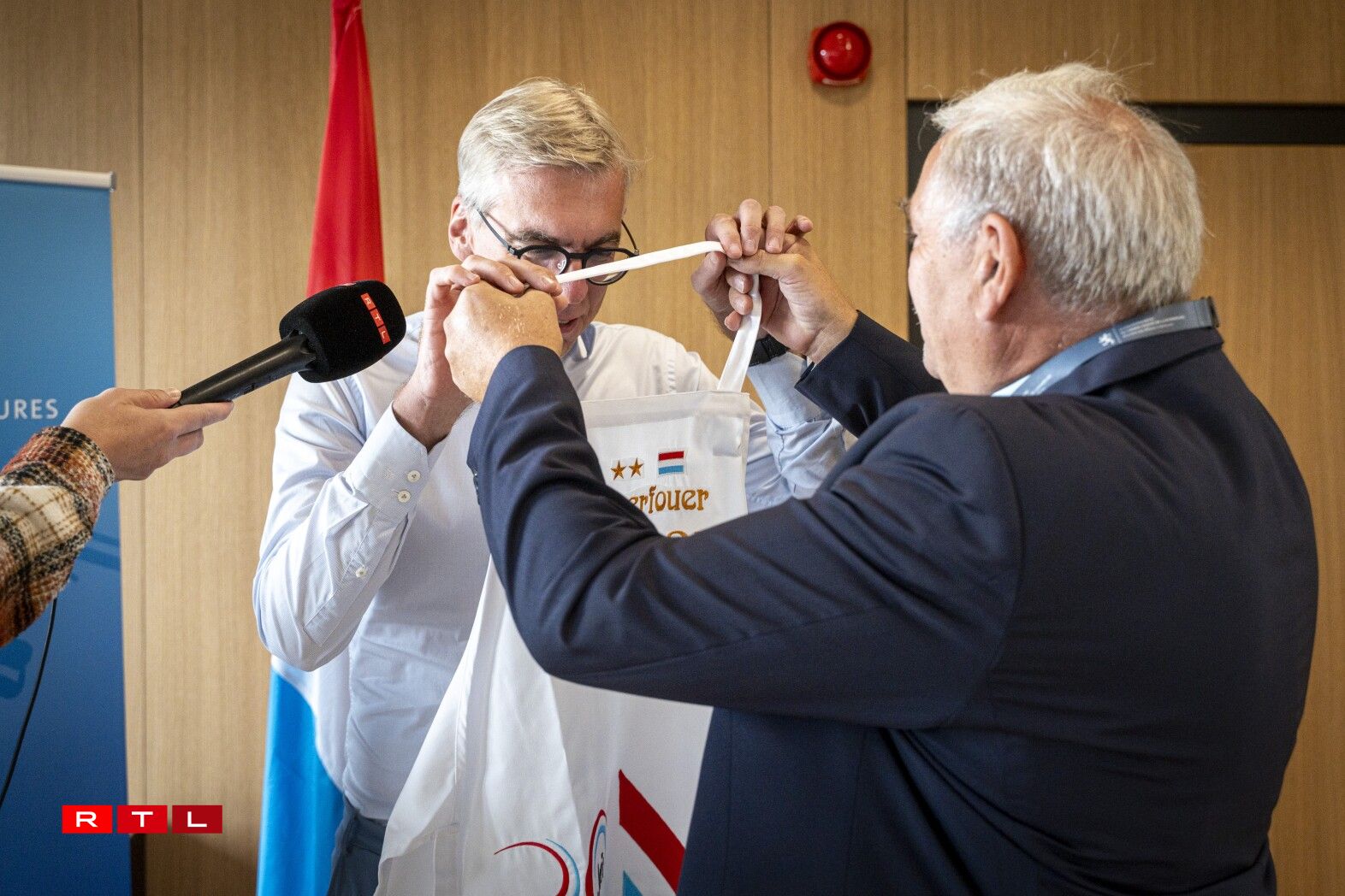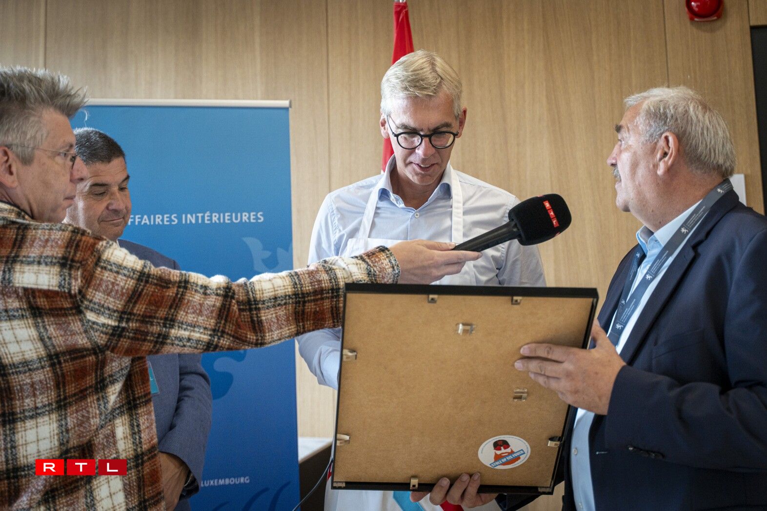 Dowéinst sinn en Donneschdeg de Moien de President Charel Hary a säi Sekretär Gilbert Legil bei hien an de Ministère gaangen, fir him dat schéint Schiertech, e Souvenir fir 20 Joer Buergermeeschterdag an e Bild mam Logo 'Ech sinn stolz op eis Fouer' z'iwwerreechen
