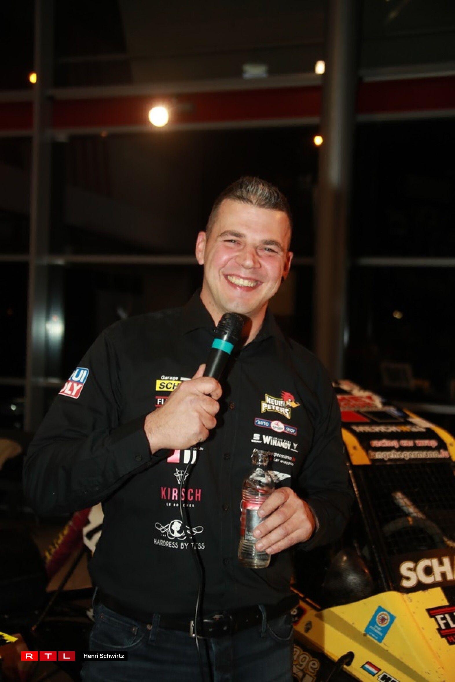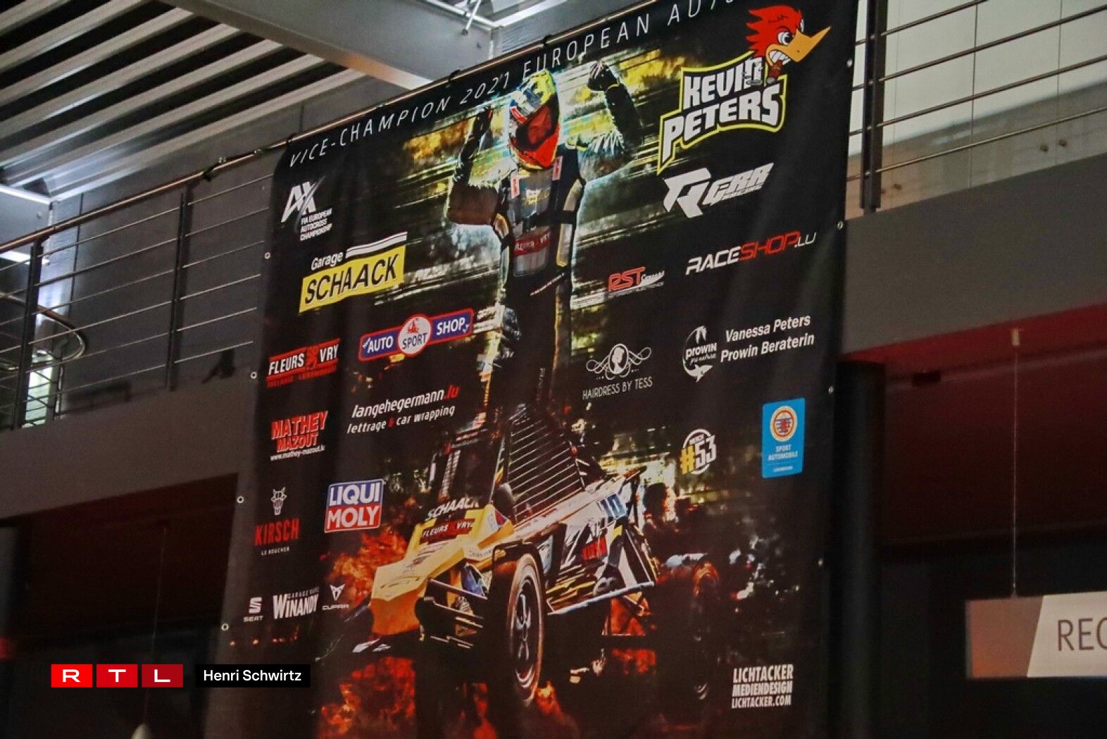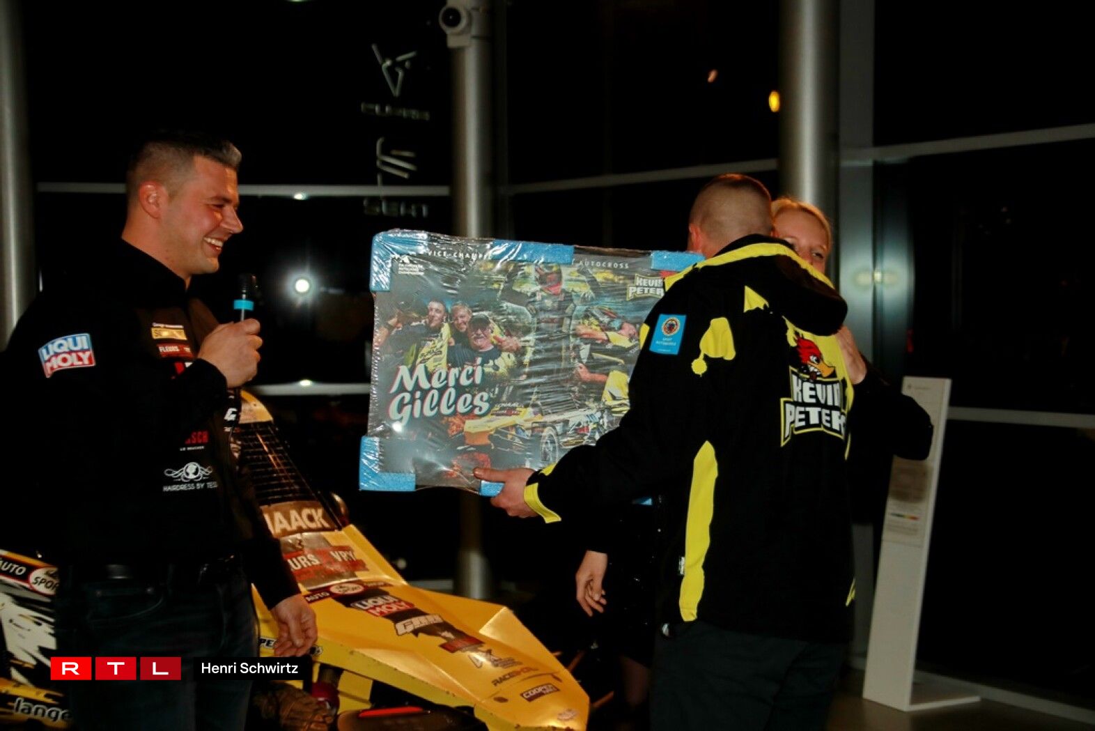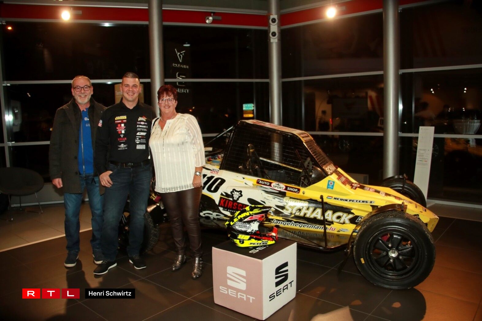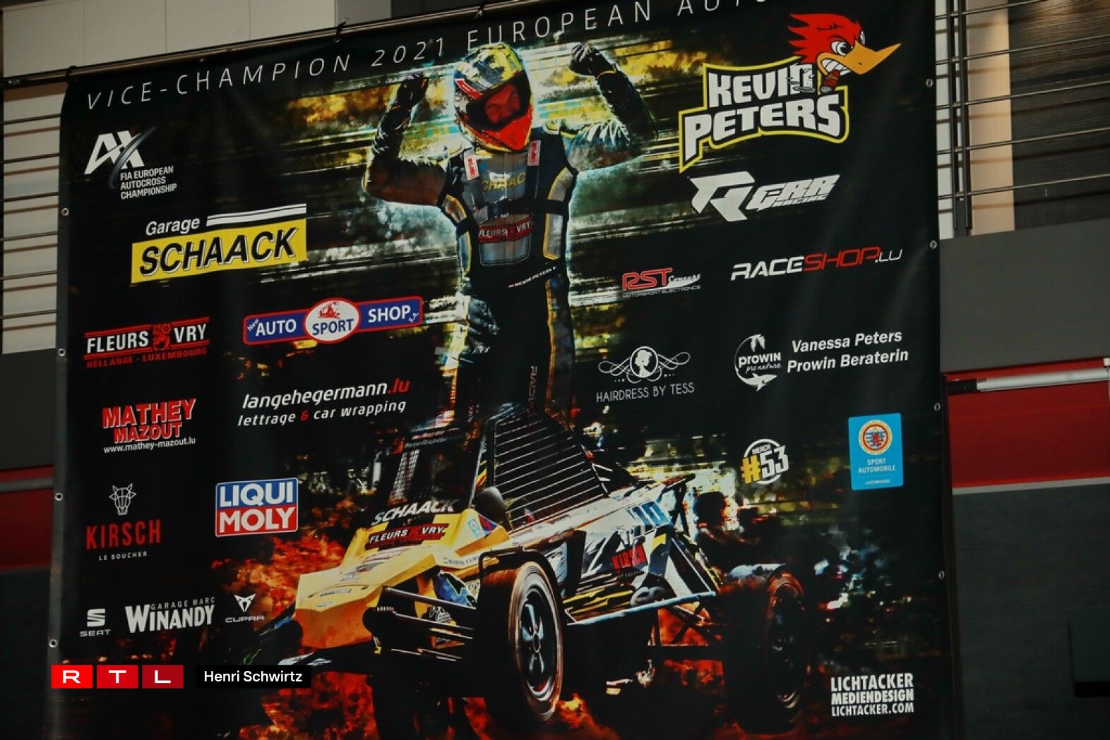 De Kevin Peters, 2. an der Europameeschterschaft am Autocross op internationalem Niveau hat agelueden, fir säin Titel ze feieren.