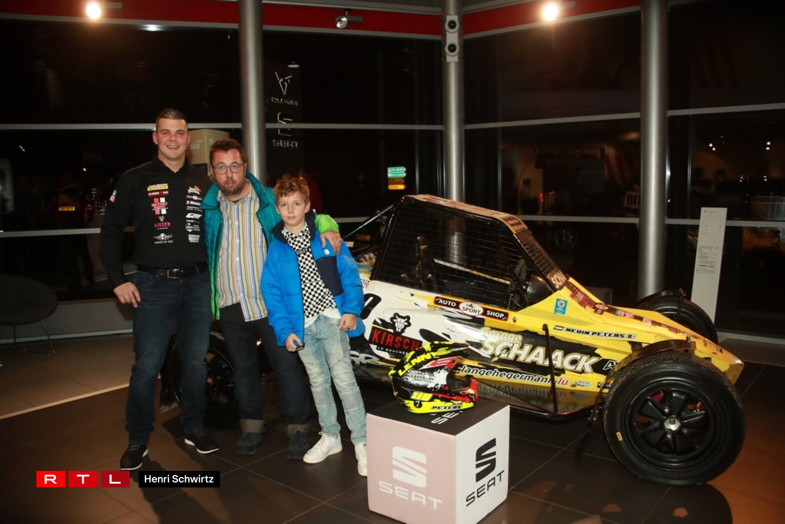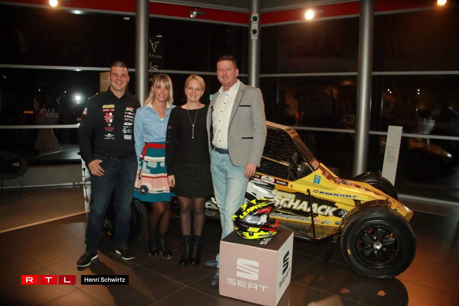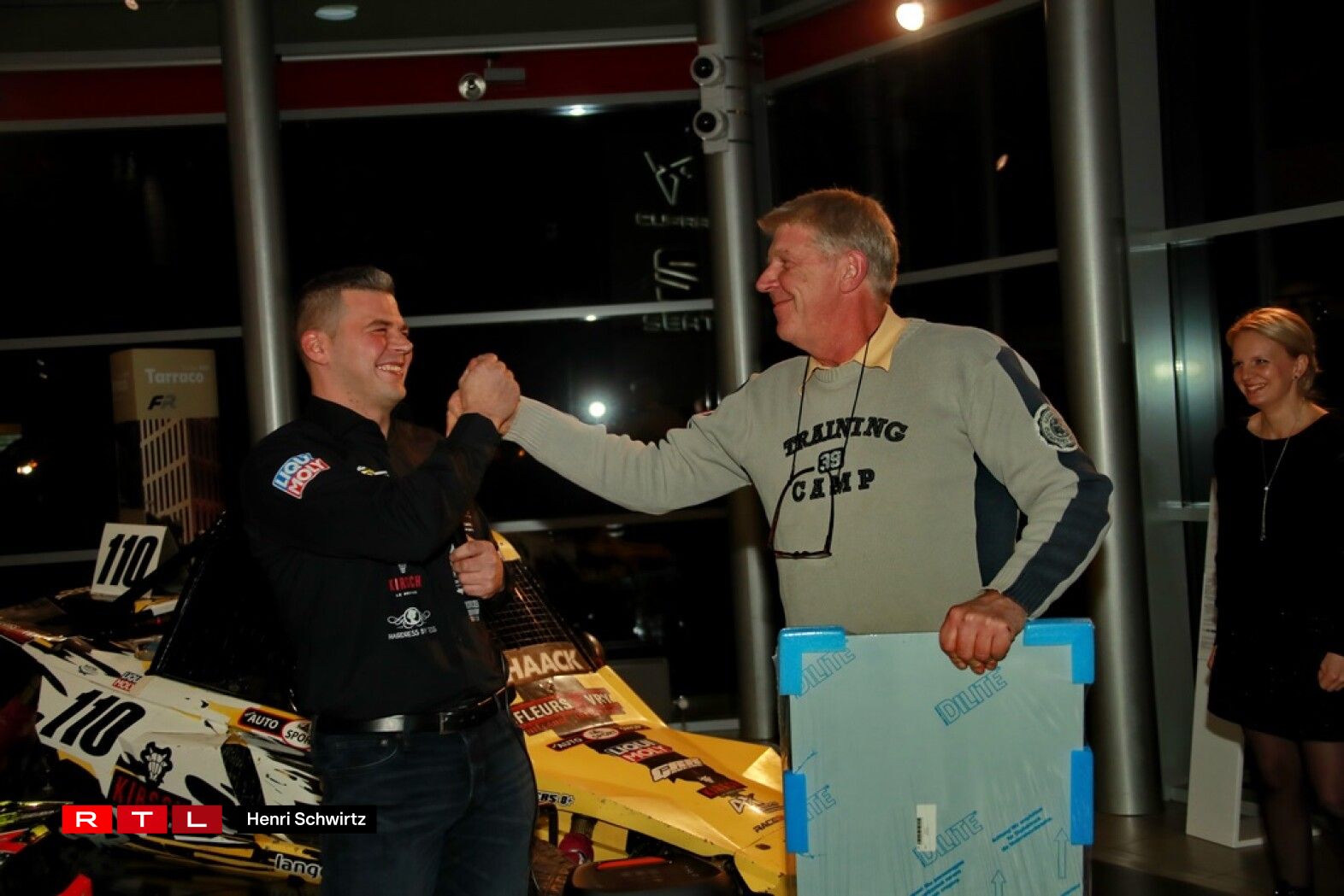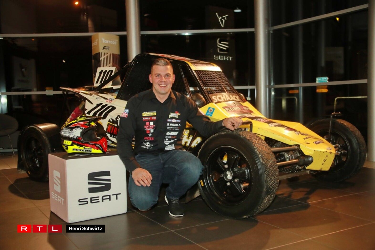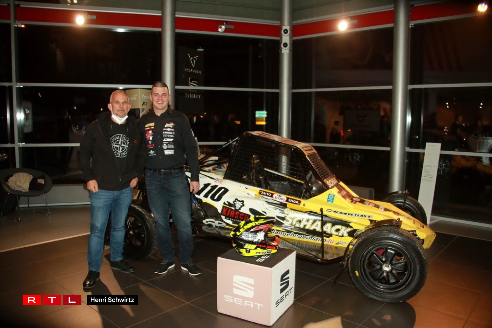 De Kevin Peters, 2. an der Europameeschterschaft am Autocross op internationalem Niveau hat agelueden, fir säin Titel ze feieren.