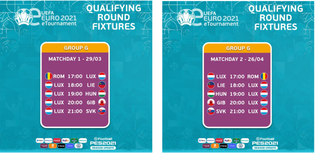 Gespillt gëtt Pro Evolution Soccer (PES) an d’Qualifikatiounen ginn den 29. Mäerz an de 26. Abrëll gespillt.