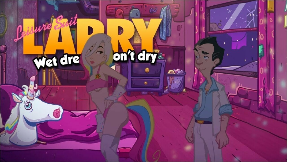 „Leisure Suit Larry: Wet dreams dry twice“ ass fir PC a Mac erauskomm a kritt een zum Beispill op Steam.