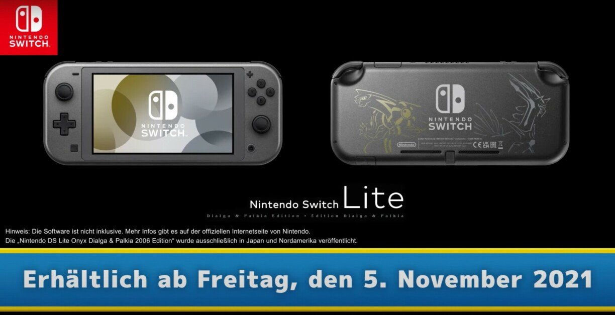Doriwwer eraus, kënnt nach eng speziell Nintendo Switch Lite am Pokémon Design eraus. Op dëser sinn d’Pokémon Dialga a Palkia ze gesinn an se wäert viraussiichtlech de 5. November 2021 op de Marché kommen.