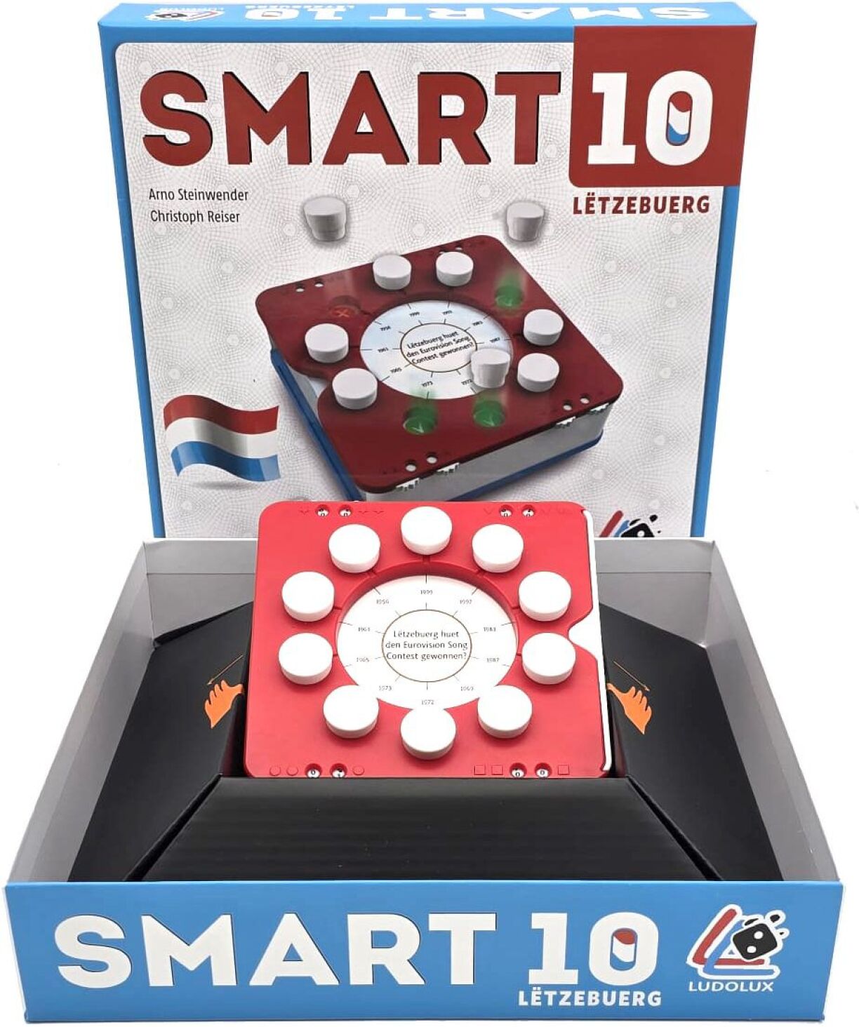 Zënter dësem Weekend gëtt et dann och elo eng speziell Lëtzebuerg-Editioun vu Smart 10, erausbruecht vu Ludolux. Net nëmmen dréie sech alleguerten d’Froen ausschliisslech iwwert d’Theemen iwwert an aus dem Grand-Duché, ma d’Spill ass och komplett op Lëtzebuergesch, souwuel d’Froen an Äntwerten, wéi och d’Reegelen.