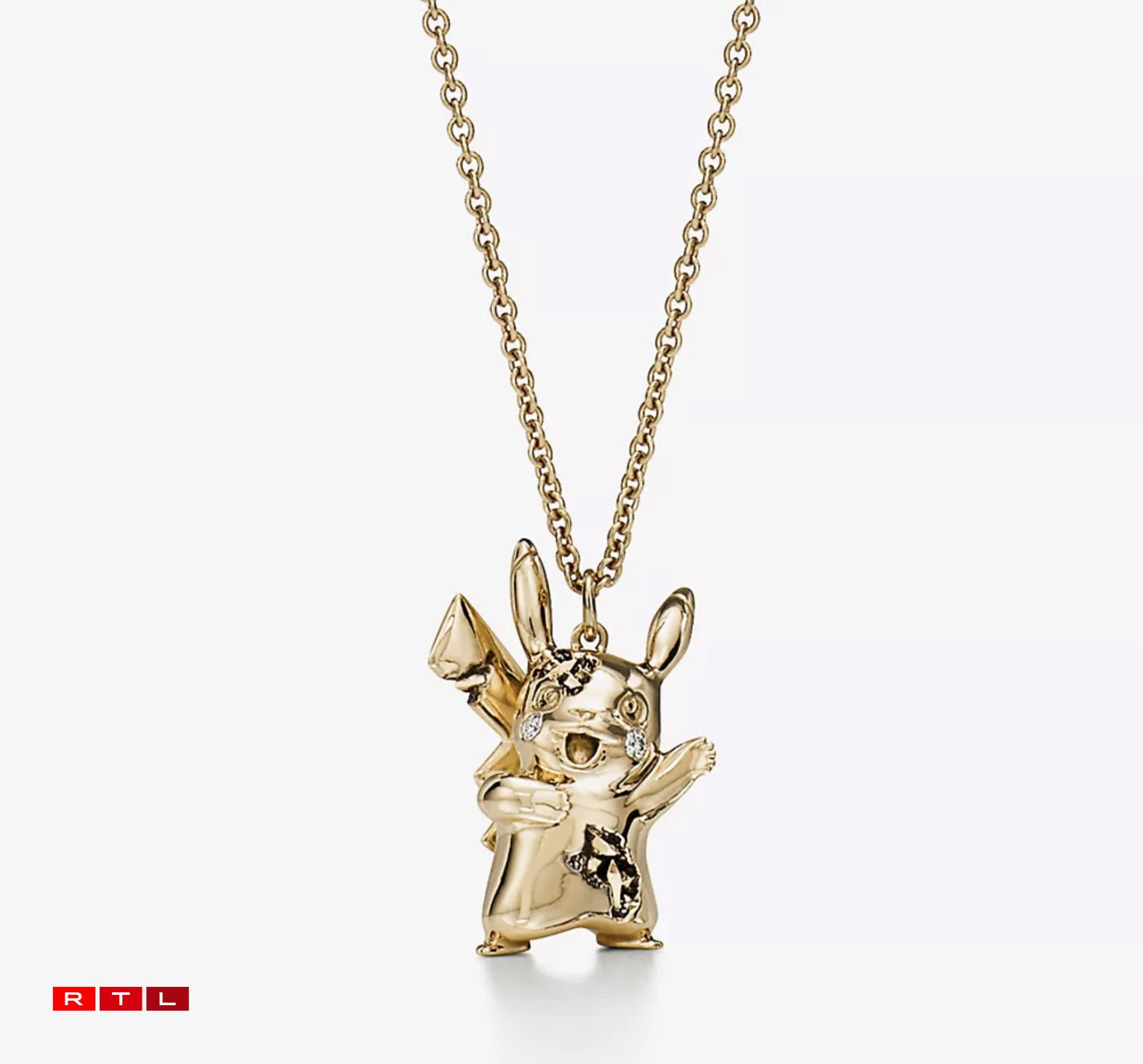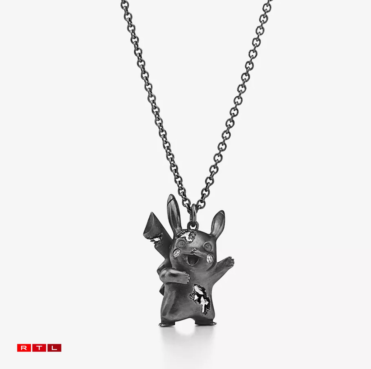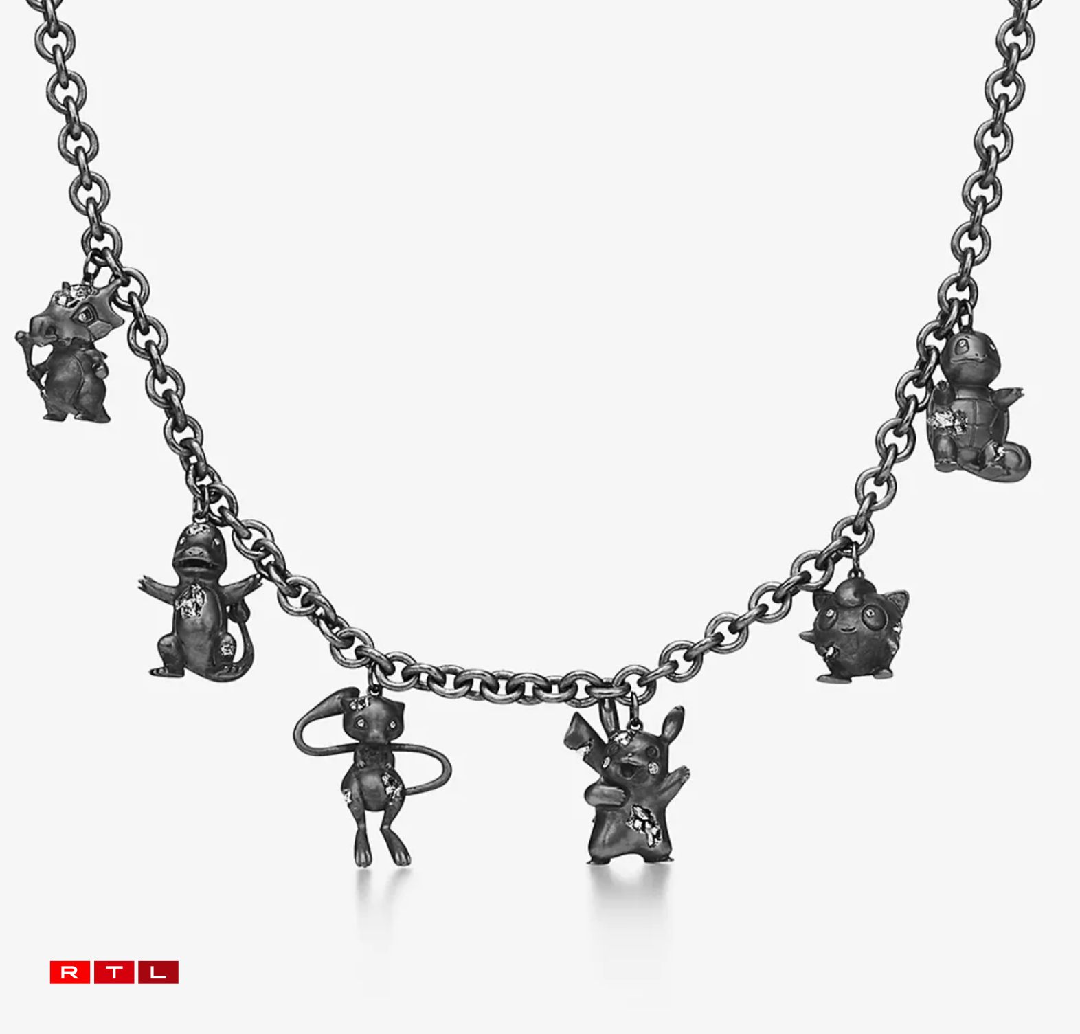 Wann ee bereet ass, 1.186 Euro fir e Kettenunhänger auszeginn, dann huet een de Choix tëscht am Ganzen 9 verschiddene Pokémon-Unhänger. Dorënner ënner anerem de Glumanda, de Schiggy, de Pummeluff, de Mew, den Tragosso oder de Pikachu. Dës Unhänger sinn aus oxidéiertem Sterling-Sëlwer gemaach a ginn an enger turquoiser Këscht geliwwert.