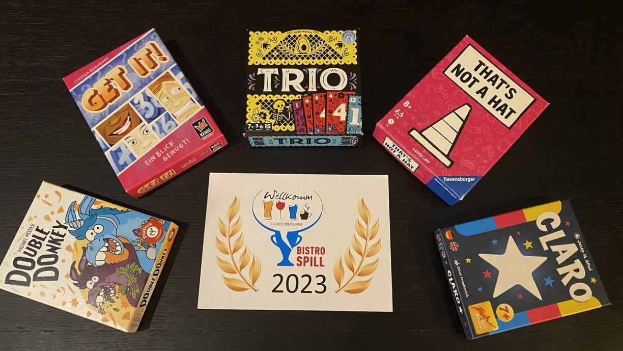 Um Belval huet d’Jury sech e Mëttwoch den Owend getraff, fir aus am Ganze 5 Spiller “d’Bistrospill” vum Joer auszewielen. Nominéiert dëst Joer waren: “Claro”, “Double Donkey”, “Get It”, “That’s not a Hat” an “Trio”. Organiséiert gouf de Präis, deen elo scho fir déi 6. Kéier vergi gouf, vun der Spillfabrik an Zesummenaarbecht mat der Horesca.