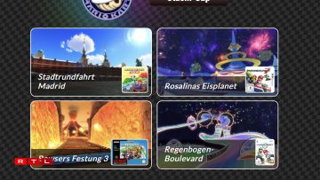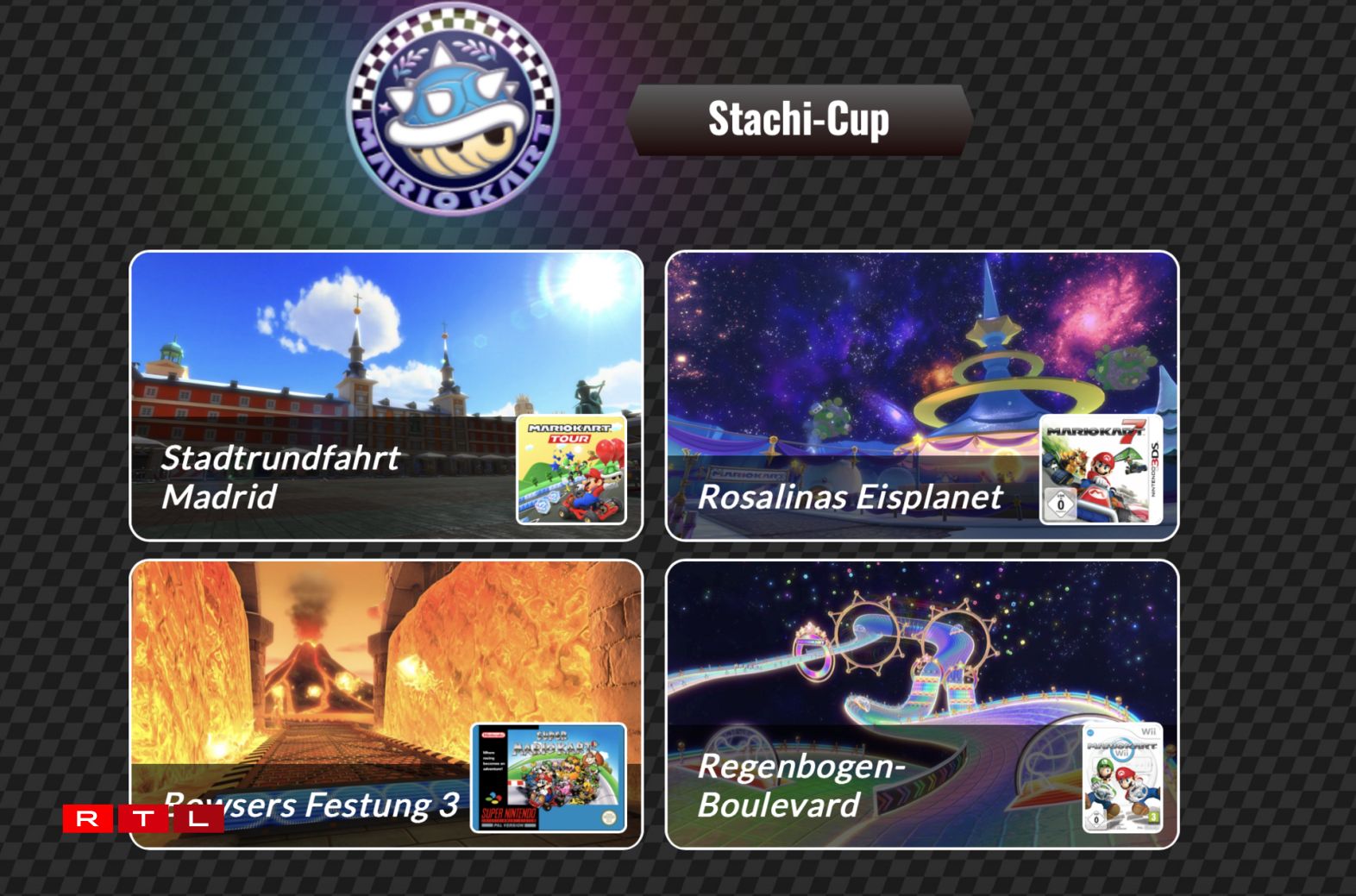 Am Stachi-Cup kënnen d’Fans vum Spill hir Famill a Frënn op de Strecke Stadtrundfahrt Madrid (Mario Kart Tour), Rosalinas Eisplanet (Mario Kart 7), Regenbogen-Boulevard (Mario Kart Wii) a Bowsers Festung 3 (Super Mario Kart) erausfuerderen.