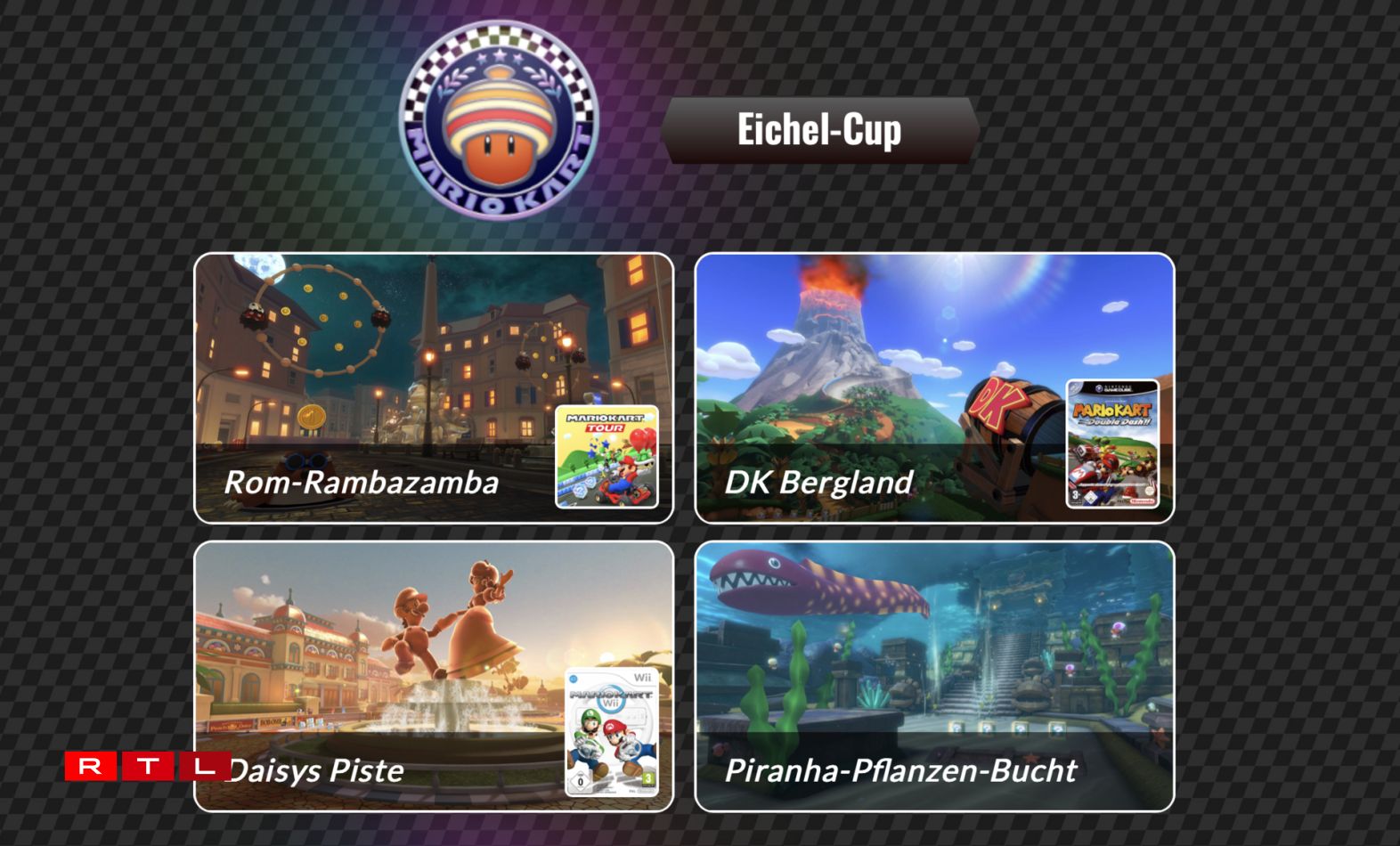 Esou kënnen d’Fans vum beléifte Racing-Spill zënter dem 9. November am Eechel-Cup souwéi am Stachi-Cup op aacht neie Strecken hiert Onwiesen dreiwen. Am Eechel-Cup kënnen d’Spiller an d’Spillerinnen deemno op de Strecke Rom-Rambazamba (Mario Kart Tour), DK Bergland (Mario Kart: Double Dash!!), Daisys Piste (Mario Kart Wii) a Piranha-Pflanzen-Bucht (Mario Kart Tour) Vollgas ginn.