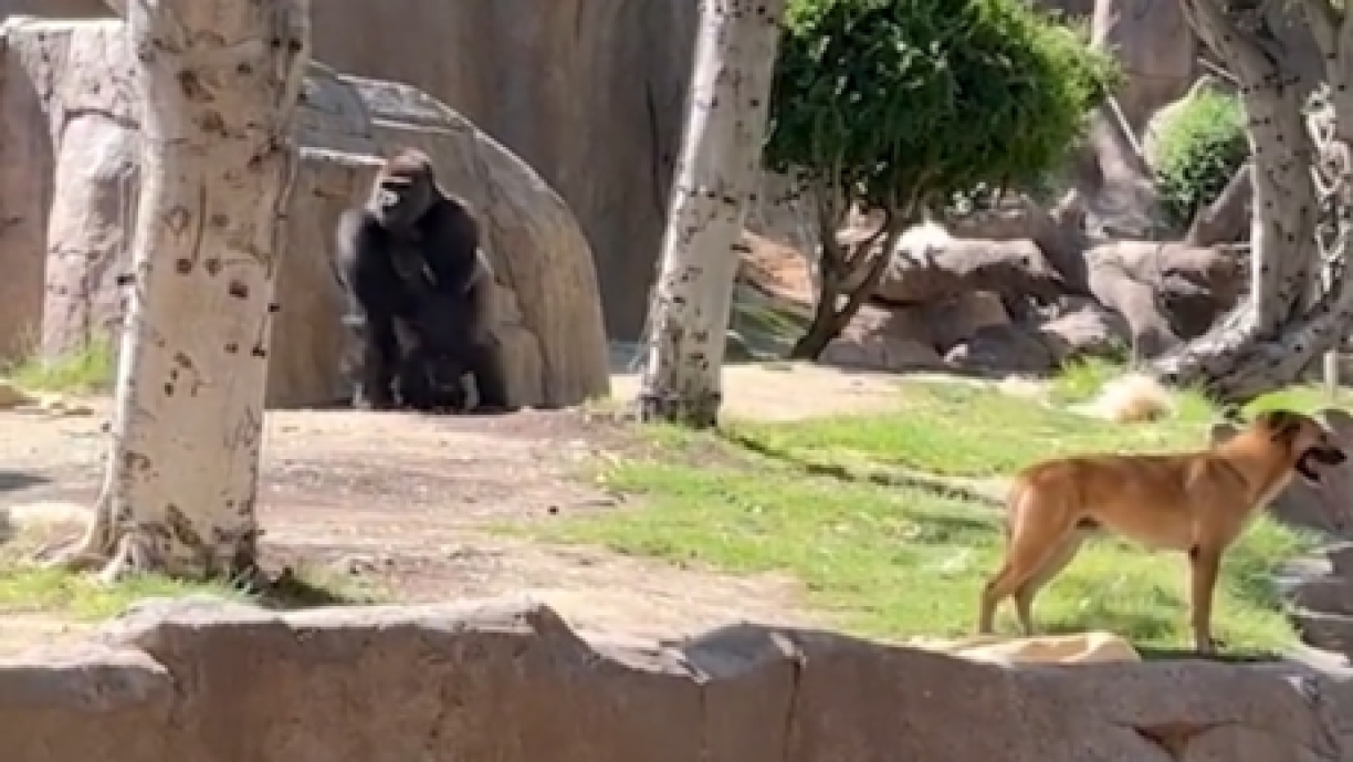 Zanter e puer Deeg maache Videoen, déi lescht Woch am Zoo zu San Diego gemaach goufen, d’Ronn. Drop ze gesinn: en Hond an engem Afen-Areal, dee vun zwee Gorillae gejot gëtt. Op den Opname wierkt den Hond verängschtegt, wéi e versicht, de Gorillaen z’entkommen. Wéi de Mupp an hire Beräich andrénge konnt, ass net gewosst. Besuergten Hondsbesëtzer konnten am Zoo och net ugetraff ginn. En Chip gouf och net beim Schäferhond-Mix fonnt.