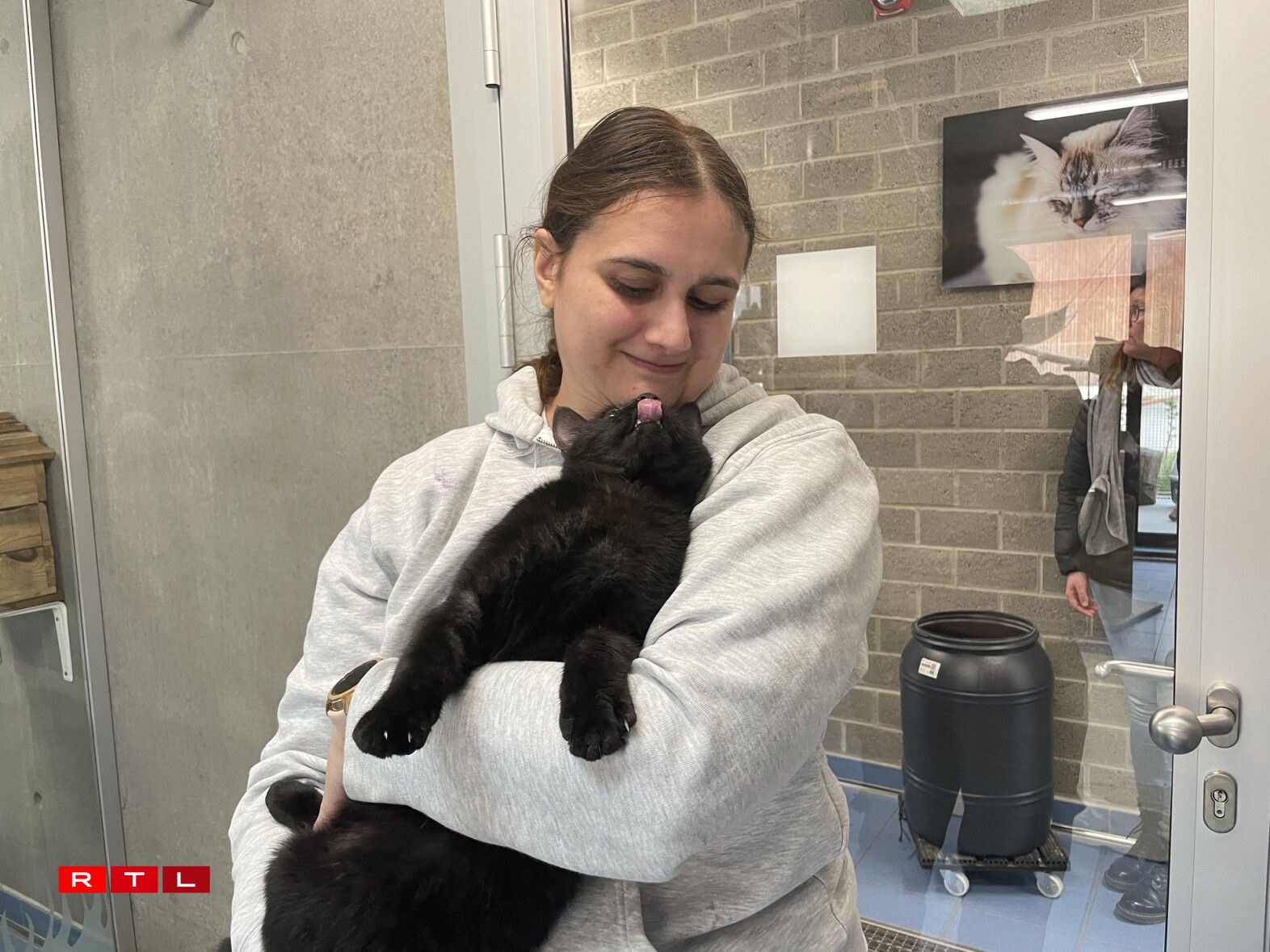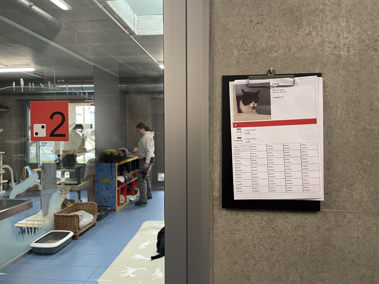 Sinn d’Kazen all do, geet et un d’Botze vun de Raim. Wéi Déierebesëtzer wëssen, maachen hir Liblinge vill Knascht. A bei 15 Kazen an engem Raum kënnt däers emol vill beieneen. Dono geet et da fir den Andy a seng Ekipp un d’Fidderen. Och hei gëtt mat Piktogrammer geschafft. An der gutt organiséierter Kiche sti Classeuren, an deenen d’Mataarbechter d’Informatiounen zu den eenzele Raim fannen, an esou wëssen, wéi vill Schossele si pro Raum fëlle mussen. D’Kaze kréien hiert Fudder an de Raum gestallt a ginn zesumme gefiddert, dowéinst kréien d’Kazen all dat selwecht Fudder. Aus deem Grond huet ee bei der HoKa d’Decisioun geholl, keng Kaze mat Allergien opzehuelen, well de Risk, datt eppes geschitt, einfach ze grouss ass, erkläert eis d’Carine Schreiber. Mëttes kënnt dann dem Andy seng Liblingsbeschäftegung drun – mat de Kaze spillen a schmusen.