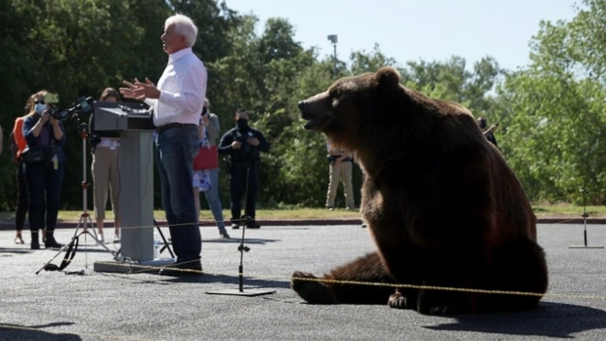 De Bier souz wärend dem ganzen Evenement gedëlleg nieft dem Cox an huet sech geleeëntlech mol d’Fell gebotzt. Dat 500 Kilo schwéiert Déier gouf dofir trainéiert, a Filmer a Serien opzetrieden.