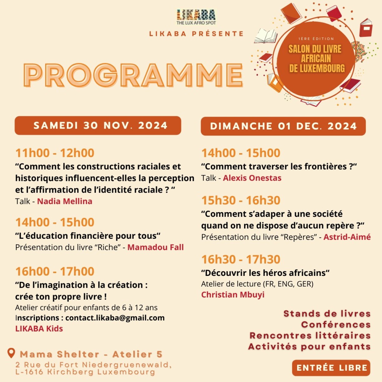 L’association Likaba est fière d’annoncer la tenue du tout premier Salon du Livre Africain de Luxembourg, un événement unique qui mettra en lumière la richesse et la diversité de la littérature africaine. Cet événement exceptionnel aura lieu le samedi 30 novembre et le dimanche 1er décembre de 10h à 18h, au Mama Shelter, et réunira auteurs, éditeurs, et amoureux des lettres venus d’Afrique et d’ailleurs.