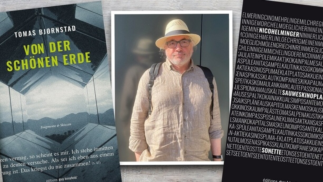 Ënnert béiden Nimm huet den zweefache Servais-Laureat elo all Kéiers en neit Buch erausbruecht: “Von der schönen Erde” ass eng Sammlung vu Skizzen a Fragmenter aus der Fieder vum Tomas Bjørnstad an de Gedichtband “Saumes Kinoplakat” ass vum Nico Helminger. Allebéid sinn se bei den Editions Guy Binsfeld erauskomm.