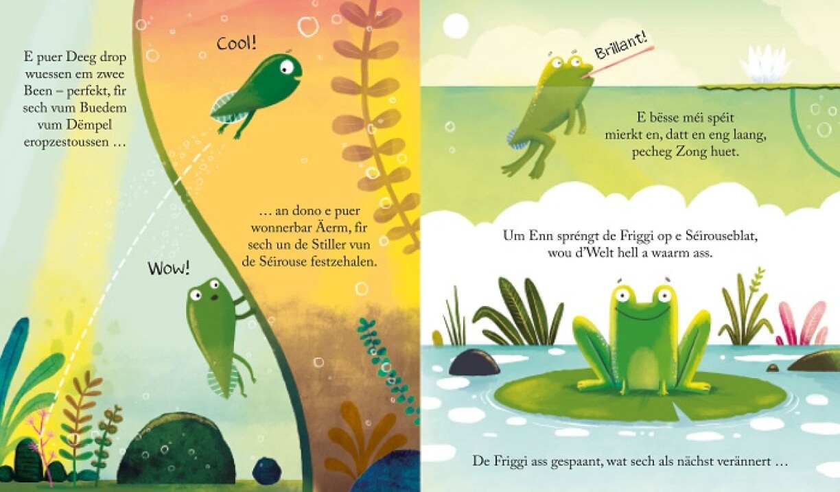 Eemol Fräsch, ëmmer Fräsch – esou kéint een dëst superflott neit Kannerbuch resüméieren: Am Ufank ass de Friggi en Ee aus enger Bruck, dat eleng an engem Dëmpel schwëmmt. Ganz séier fänkt de Friggi un, sech ze veränneren: Him wuessen Äerm a Been an eng laang, pecheg Zong. Mee dann halen d’Verännerungen op eemol op an de Friggi ass e langweilegen, ale Fräsch. Oder éieren net?