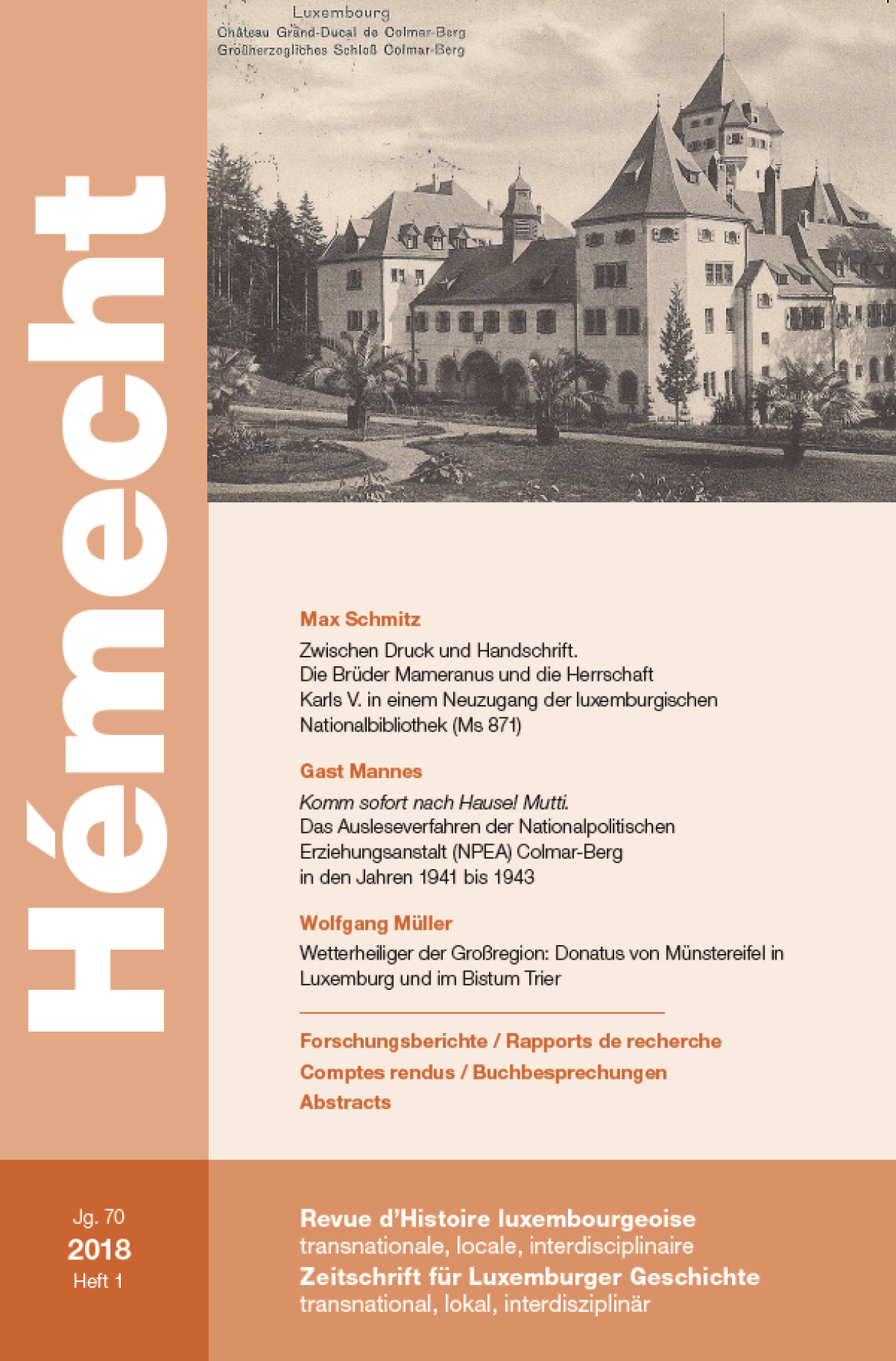 Les origines du culte de saint Donat de Munstereifel, vénéré au Luxembourg et dans la Grande Région comme protecteur contre les orages sont dues plutôt aux Capucins qu’aux Jésuites : c’est ce qui ressort de la première partie d’une dissertation doctorale de 1956 du Sarrois Wolfgang Müller que la Hémecht publie en quatre parties en 2018. Cette longue contribution est précédée d’une présentation par Max Schmitz d’un nouveau manuscrit récemment acquis par la Bibliothèque nationale qui contient des textes sur le règne de Charles Quint dus e. a. au Luxembourgeois Nicolas Mameranus. Gast Mannes exploite un fonds d’archives privé qui lui permet de retracer les conditions d’admission et les épreuves scolaires des jeunes filles qui ont fréquenté de 1941 à 1943 la Nationalpolitische Erziehungsanstalt que les nazis avaient installée au château grand-ducal de Colmar-Berg. Quatre étudiants résument leurs travaux de recherche : Fabienne Meiers a analysé l’importance de la mobilité à cheval pour la communication au moyen âge et ses répercussions sur la ville de Luxembourg ; Michèle Platt s’est penchée sur le rôle des petites villes médiévales dans le réseau urbain de l’ancien duché de Luxembourg ; Jérôme Courtoy revient sur le comte Pierre-Ernest de Mansfeld comme lieu de mémoire au Grand-Duché et Eva Maria Klos compare les perceptions divergentes des enrôlés de force dans le Grand-Duché de Luxembourg, en Alsace-Lorraine et dans les cantons de la Communauté germanophone de Belgique.