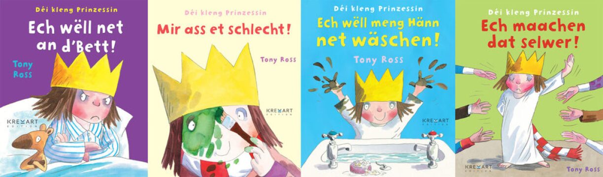 Domat gëtt et elo ewell véier Geschichte vun der “Klenger Prinzessin” op Lëtzebuergesch: “Ech wëll net an d’Bett!”, “Mir ass et schlecht!”, “Ech wëll meng Hänn net wäschen!” an “Ech maachen dat selwer!”. Am Hierscht kënnt eraus: “Ech wëll d’Luucht un!” Tony Ross