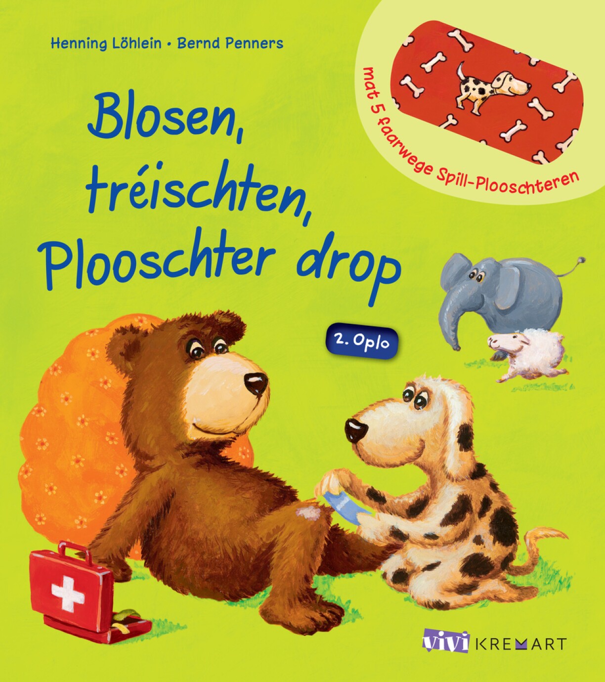 De Summer ass d’Zäit vun de kuerze Boxen a leider och vun den oppene Knéien. Ma mat dësem Buch ass dat kee Problem méi! “Blosen, tréischten, Plooschter drop” heescht et a scho sinn all d’Déieren nees gesond a monter a loosse sech nei Topegkeeten afalen. Am Original vum Henning Löhlein a Bernd Penners bei Ravensburger, vum Christiane Kremer fir Kremart op Lëtzebuergesch iwwersat. D’Buch, dat 2016 als Iwwersetzung erauskoum, war eenzock ausverkaaft, ma ass elo nees ze kréien. Et huet fest Säiten an et si fënnef Spill-Plooschteren dran integréiert, déi d’Kanner op d’Boboe vun den Déiere peche kënnen. Et kann ee se esou dacks benotzen, ewéi ee wëll, well se si liicht propper ze halen. En interaktive Spill-Spaass, deen d’Boboe séier vergiessen deet ...