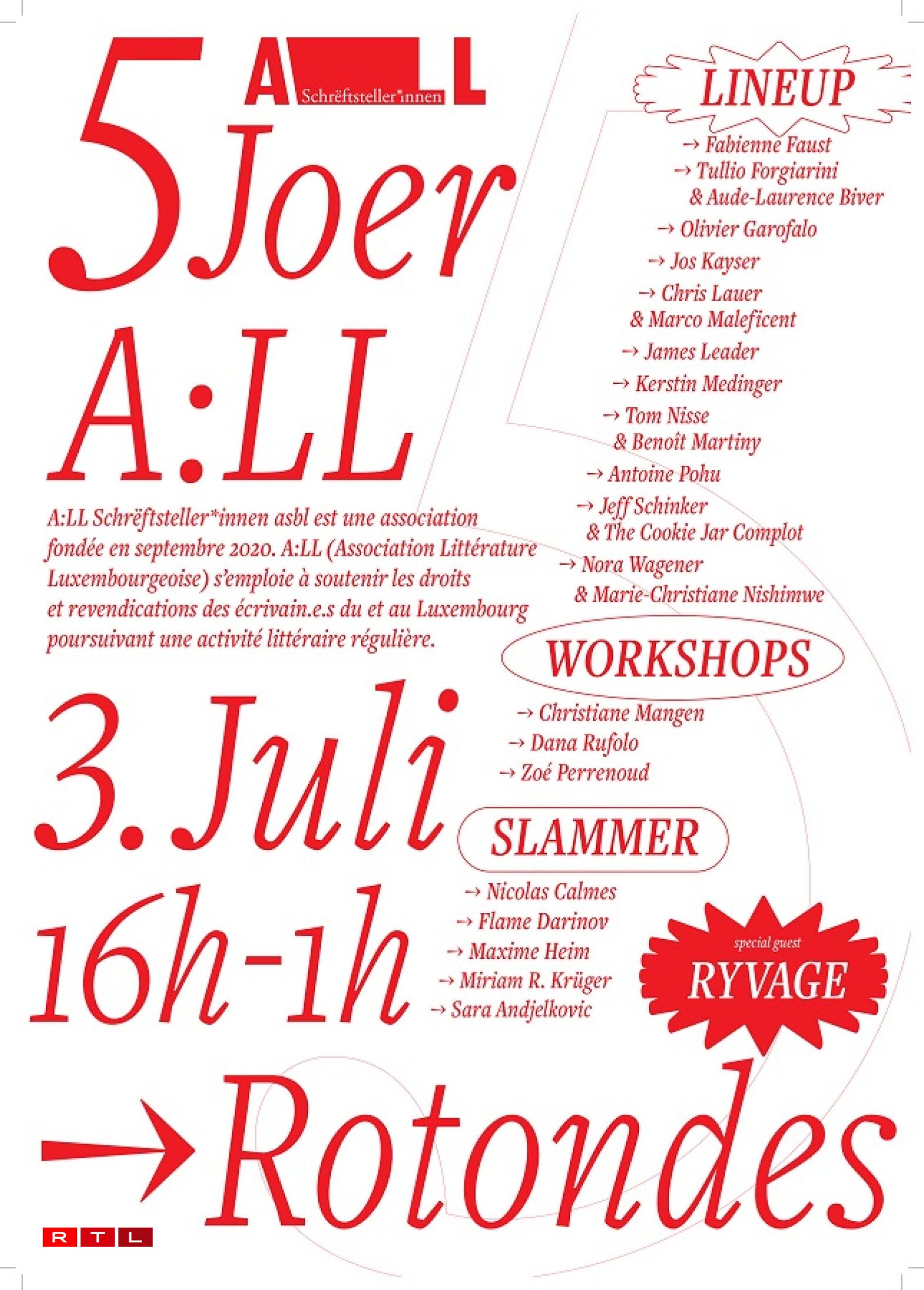 E Poetry Slam dee mat engem Ex Aequo fir de Flame Darinov an den Nicolas Calmes op en Enn gaangen ass an eng Rëtsch Optrëtter bei der Literatur a Musek sech d’Bün gedeelt hunn, stoungen um Programm. Sou zum Beispill Jeff Schinker & The Cookie Jar Complot oder eng Liesung vun der Nora Wagener bei der si vun der Sängerin Marie-Christine Nishimwe begleet gouf. Déi Responsabel vun A:LL Schrëftstellerinnen, der Associatioun déi 2020 als Nofolger vun dem 2016 opgeléisten Lëtzebuerger Schrëftstellerverband (LSV) gegrënnt gouf, haten sech eppes afale gelooss.