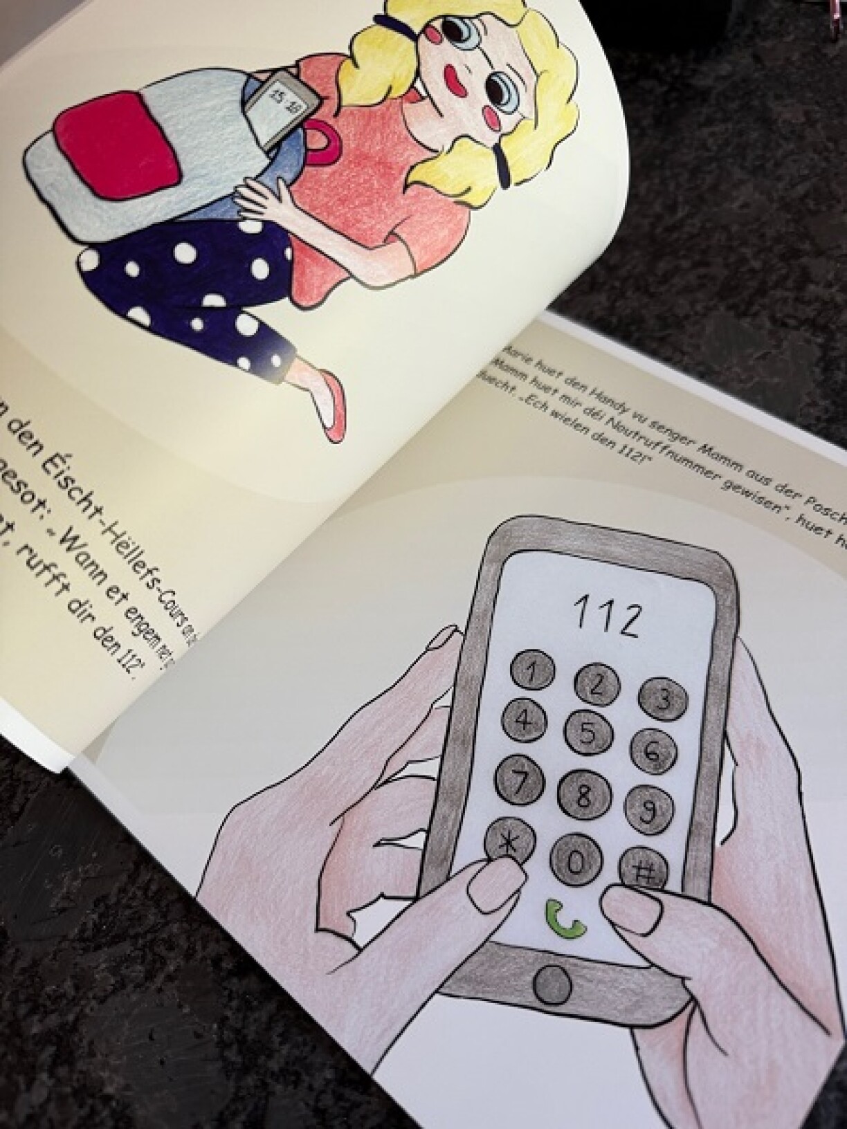 “D’Marie rett den Dag” ass ee Buch fir di ganz Kleng. Et geet drëm dass ee Bouf sech op der Spillplaz verletzt an dass d’Marie éischt Hëllef leescht an d’Ambulanz rifft.