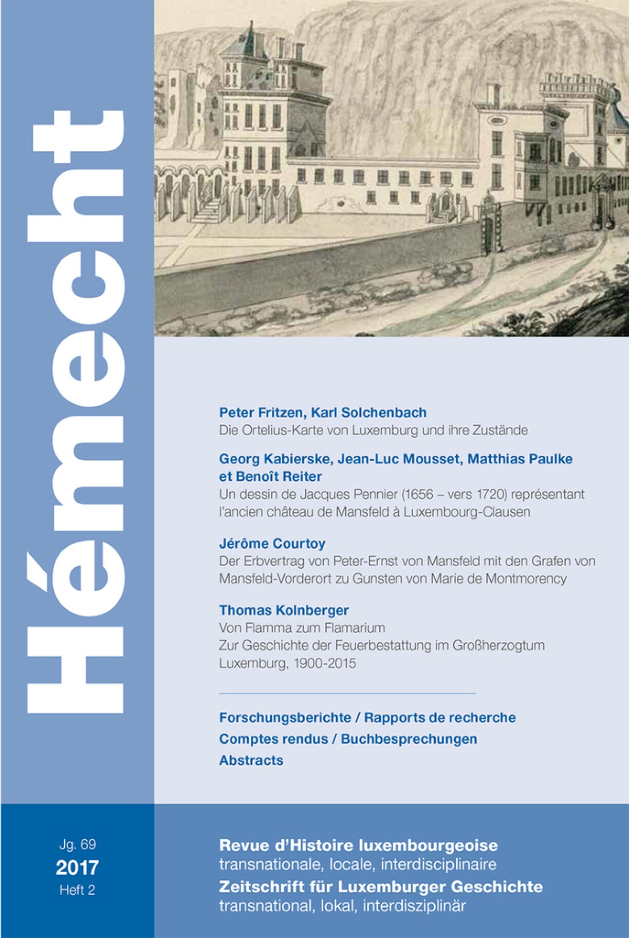 In Heft 2/2017 der Zeitschrift für transnationale Luxemburger Geschichte Hémecht beschäftigt sich ein erster Beitrag mit der bekannten Karte des Herzogtums Luxemburg, die Abraham Ortelius 1579 zum ersten Mal in seinem Theatrum Orbis Terrarum veröffentlicht hat, sowie mit allen späteren Varianten. Zwei Beiträge sind anschließend Graf Peter-Ernst von Mansfeld gewidmet, der von 1545-1604 Gouverneur von Luxemburg war und dessen 500. Geburtstag in diesen Tagen gefeiert wird. Zuerst geht es um eine Zeichnung von Jacques Pennier, die vor kurzem entdeckt wurde und die das Schloss La Fontaine im Zustand von 1684 darstellt. Sie ermöglicht erstmals eine genaue Beschreibung des Ostflügels des Clausener Schlosses. Der folgende Beitrag ediert und kommentiert den Erbvertrag von Peter-Ernst von Mansfeld mit seinen Brüdern, den Grafen von Mansfeld-Vorderort, zu Gunsten seiner zweiten Ehefrau Marie de Montmorency. Die drei Beiträge sind natürlich von zahlreichen Farbabbildungen begleitet. Ein vierter Artikel stellt die Geschichte der Feuerbestattung im Großherzogtum Luxemburg dar, von der Gründung des Vereins Flamma (1906) über den Bau eines Krematoriums (1995) bis heute.