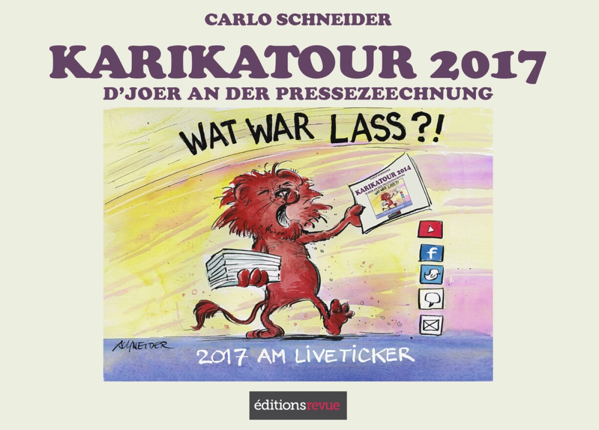 Zum Ënn des Joers blécken d’ “éditions revue” a den Carlo Schneider nach emol op déi wichtegst Momenter vun den leschten zwielef Méint zréck. Op eng gewinnt humorvoll, kritesch Manéier a mat Bëss. D’ Karikatur-Sammlung “Karikatour 2017. D’ Joer an der Pressezeechnung” wéist op 66 faarweg illustréierten Säiten, wat d’ Press dëst Joer beschäftegt huet a hëlt sech dobäi selwer net ze eescht.