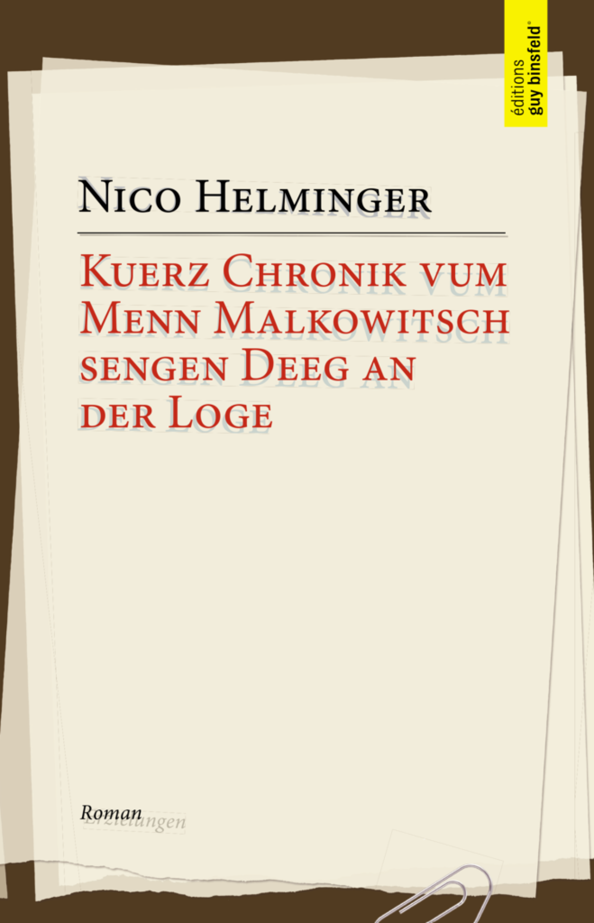 Ist es der alltägliche Zwang der eigenen Selbstvermarktung, der Zwang zur Kreativität, um sein Land erfolgreich zu vermarkten oder sind es die Stammtischgespräche in den Minette-Kneipen, bei denen er auch auf Nico Helminger trifft, die den tragischen Helden vollends abstürzen lassen? Nicht nur Malkowitschs’ eigene Wahrnehmung, auch die Grenzen zwischen den Figuren und Erzählformen verschwimmen. Ist die Hauptfigur dieses Romans das Alter Ego des Autors Nico Helminger? Wer ist der wahre Autor? Und wer ist dieser Menn, der seine Notizhefte vollschreibt und seine Tage in der Loge verbringt? Mit Kuerz Chronik vum Menn Malkowitsch sengen Deeg an der Loge stellt der Autor alles in Frage. Augenzwinkernd parodiert er nicht nur bekannte Autoren und Luxemburger, sondern zieht den Leser in einen Strudel, so dass auch am Ende dieses großen luxemburgischen Gesellschaftsromans nicht klar ist, was wahr ist und was Einbildung.