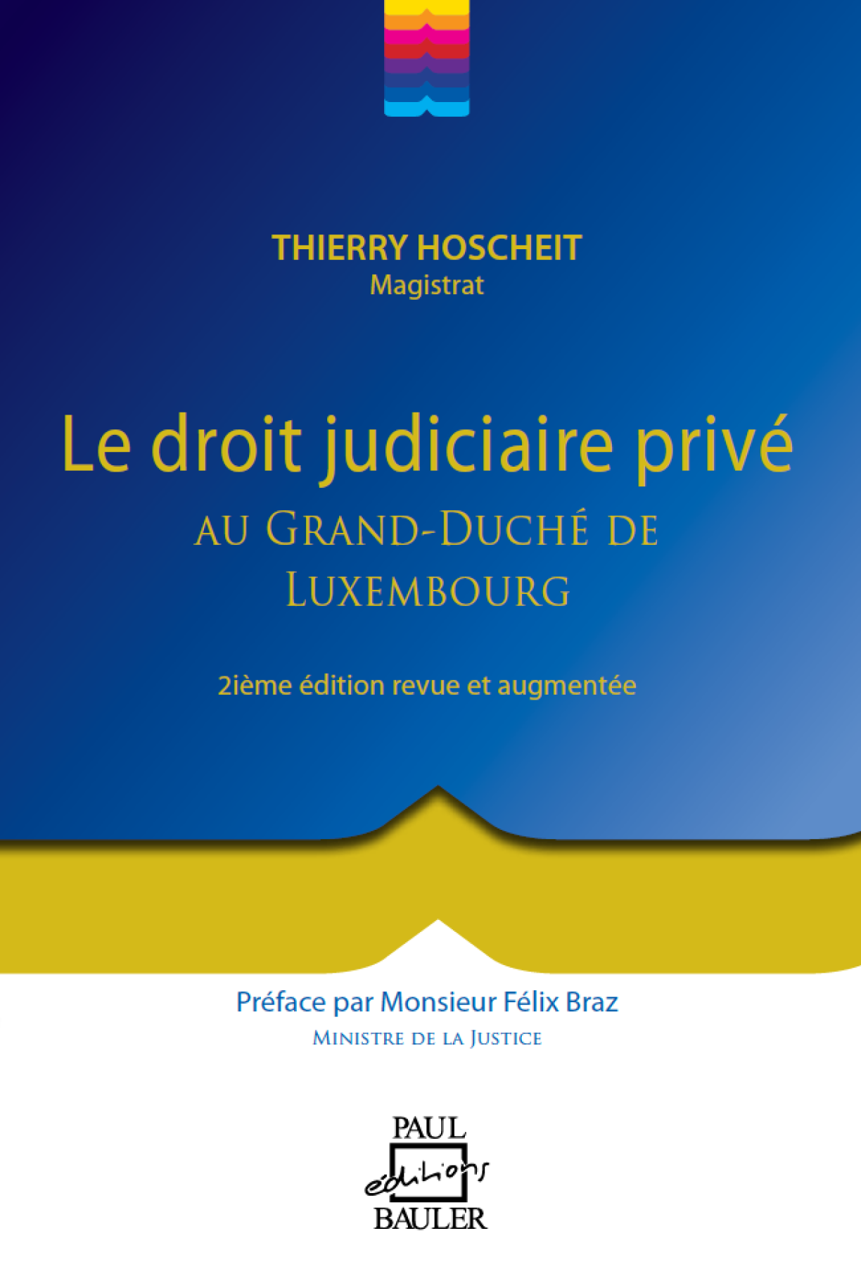 Et handelt sech ëm déi 2. Editioun (édition revue et augmentée) vum Droit judiciaire privé au Grand-Duché de Luxembourg vum Thierry Hoscheit. D’Buch kënnt eraus bei den Editions Paul Bauler (Diffusioun iwwert Librairie um Fieldgen) a kascht €198. D’ISBN ass 9782919885114.