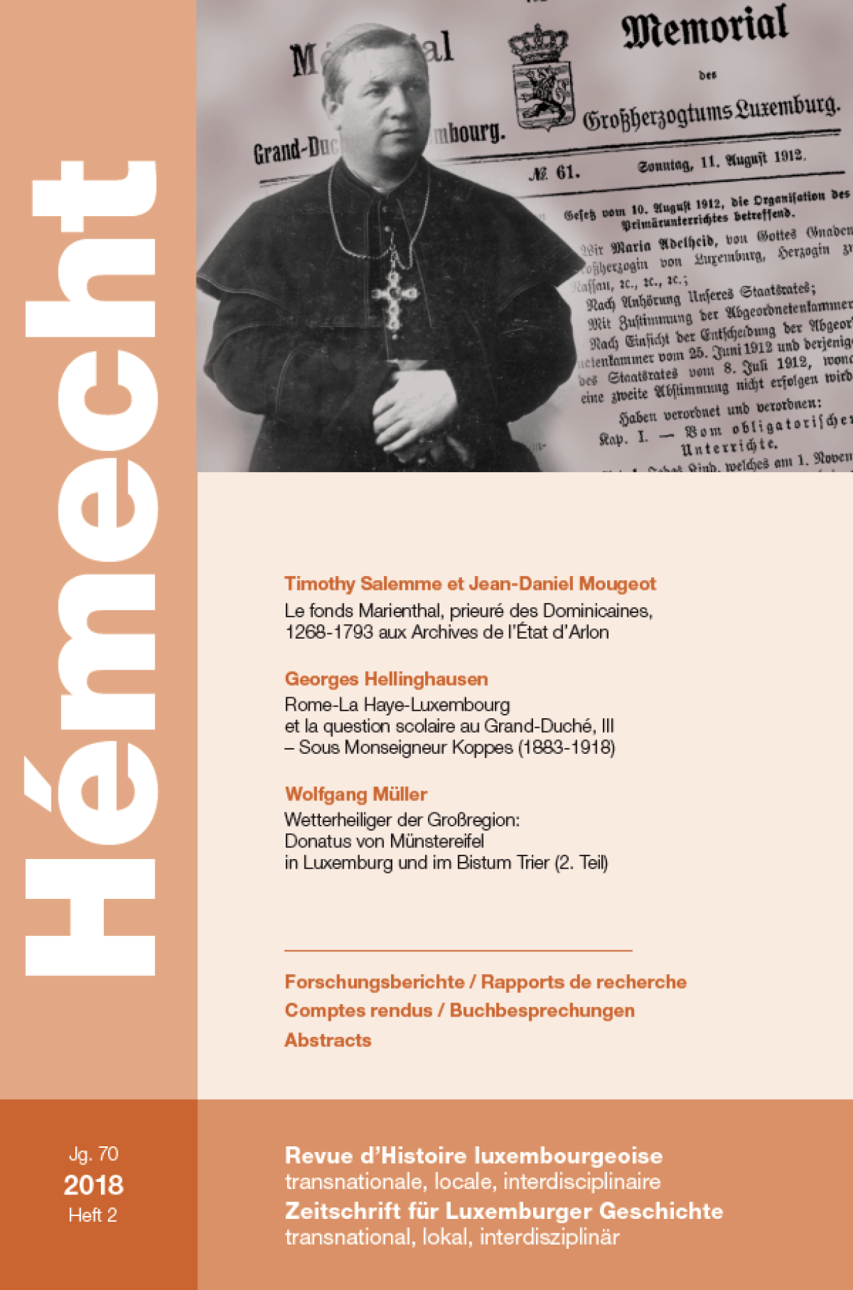 Auf den ersten Blick scheint Heft 2/2018 der Hémecht, der Zeitschrift für transnationale Luxemburger Geschichte, im Zeichen der Kirchengeschichte zu stehen. Doch dem ist nicht so. Timothy Salemme und Jean-Daniel Mougeot haben im Arloner Staatsarchiv einen Fundus an Urkunden aus dem Dominikanerinnenpriorat Marienthal im Großherzogtum Luxemburg entdeckt. Sie bieten eine kritische Edition von einem Dutzend Urkunden, die das Kartular Nikolaus’ Van Wervekes von 1885 vervollständigen, und versuchen die komplexe Archivgeschichte des Klosters aufzudröseln.