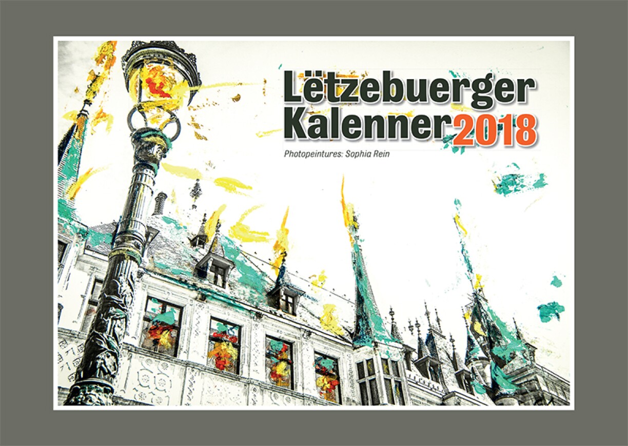 Mat dësem flotte Mountkalenner fir opzehänken, dee sech aus “photopeintures” vun der franséischer Kënschtlerin Sophia Rein (déi zu Lëtzebuerg lieft a schafft) zesummesetzt, léiere mir eis Haaptstad nei kennen. Dobäi konzentréiert sech d’Sophia Rein op markant Bauwierker a Stroosse vun der Stad Lëtzebuerg, wéi zum Beispill d’Avenue de la Liberté, d’Philharmonie, d’Gebai vun der Post um Aldringer, de Palais Grand-Ducal oder de Musée Dräi Eechelen. All eenzelt Bild beweist, datt d’Sophie Rein eigentlech vun de franséischen Impressionisten hierkënnt, an et fält op, datt si et meeschterhaft versteet, Stëmmung a Poesie mateneen ze verbannen. Kee Wonner, datt auslännesch Gäscht ëmmer erëm faszinéiert si vun der bautechnescher Diversitéit vun dëser klenger, mee onverwiesselbarer Weltstad. Opfalend un dësem fuerweprächtege Kalenner ass och, datt kee Bild deem anere gläicht. D’Sophia Rein ass vun hirer Wahlheemecht begeeschtert. Hir Freed beim Afänke vun dësen architektoneschen Herrlechkeeten ass op alle “photopeintures” spierbar.