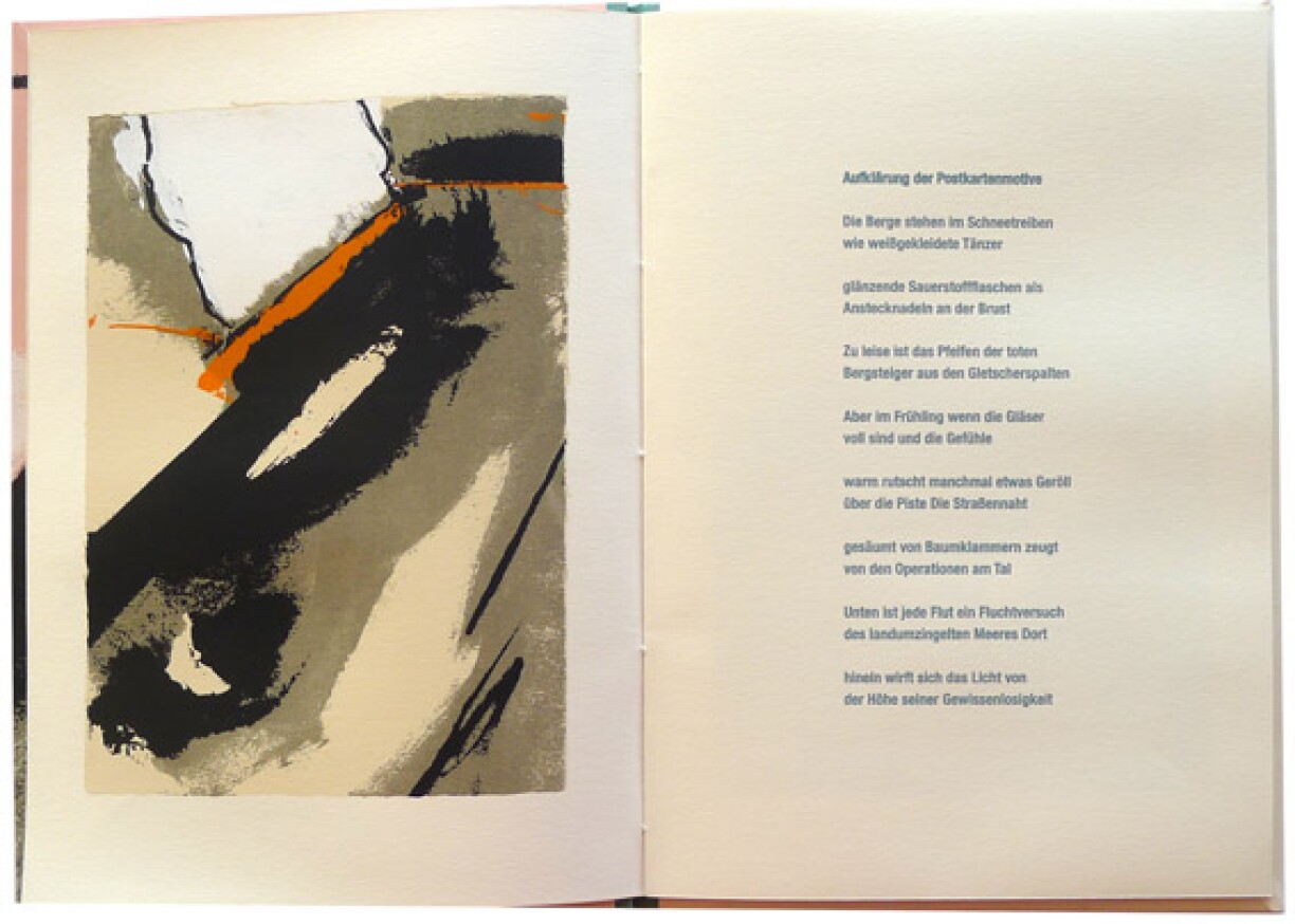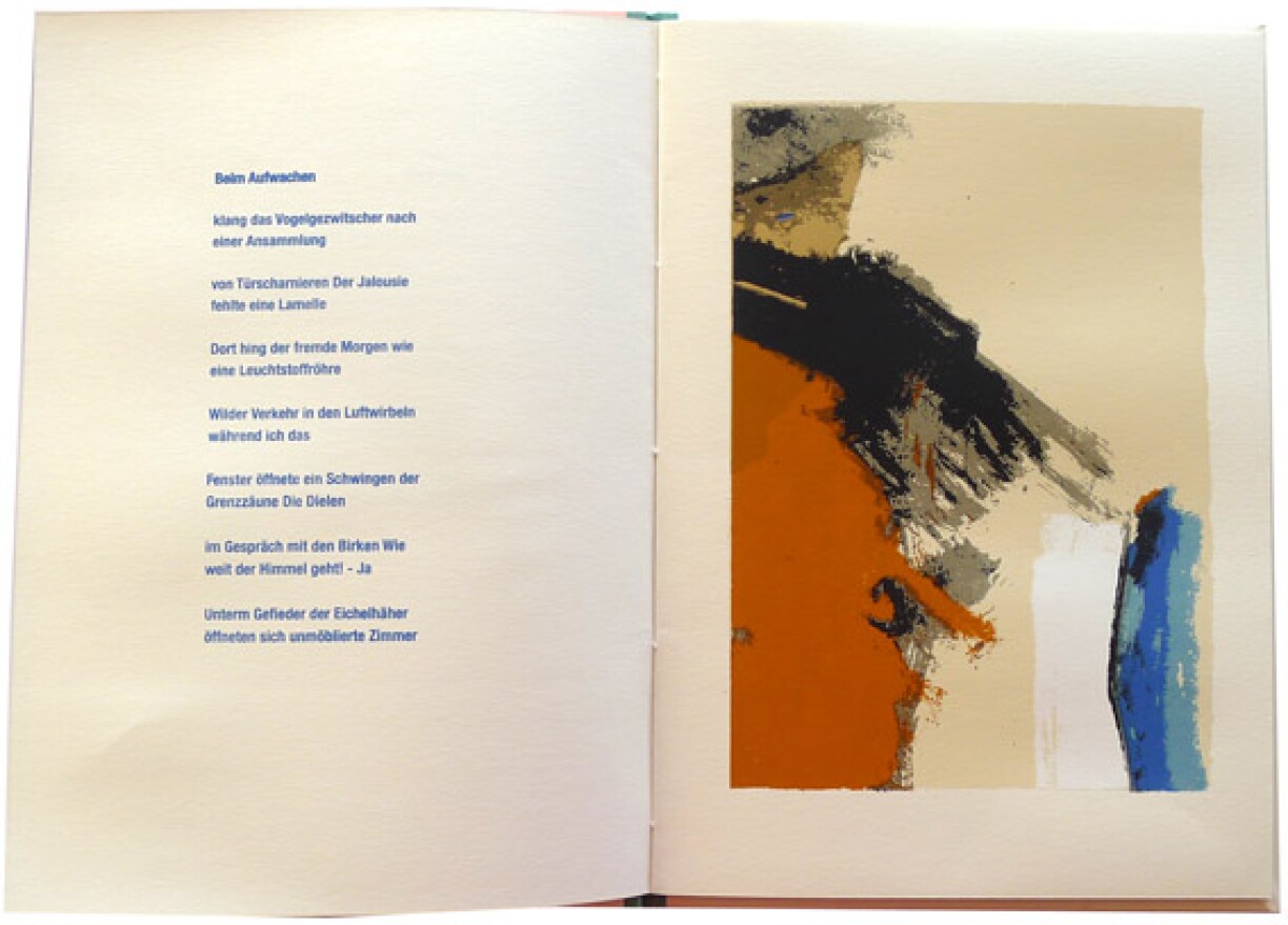 Et ass eng ganz limitéiert Oplo vum Buch, well et gi just 60 Stéck, fir 195 Euro d’Stéck. Mat handgedréckte Serigraphië vum Robert Brandy, déi déi 13 Gedichter vum Guy Helminger begleeden.