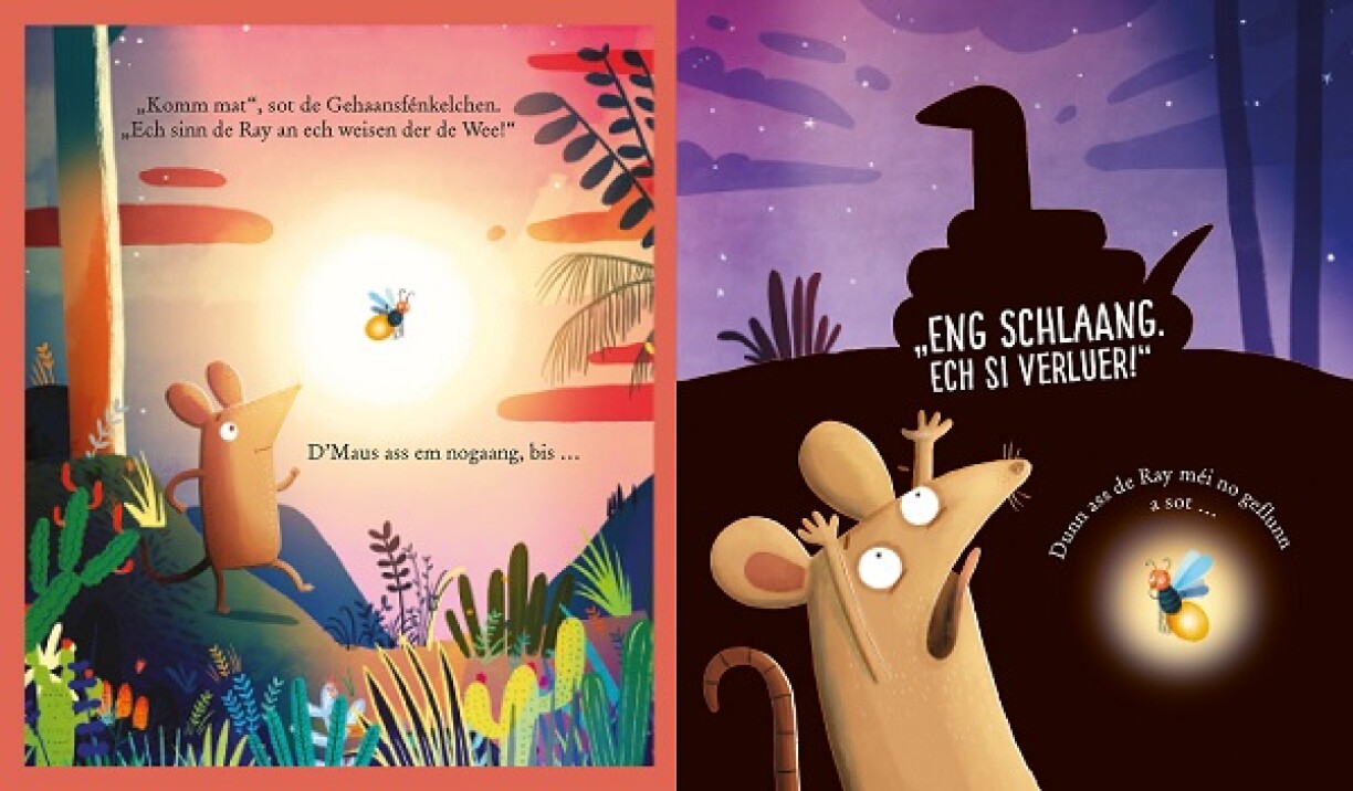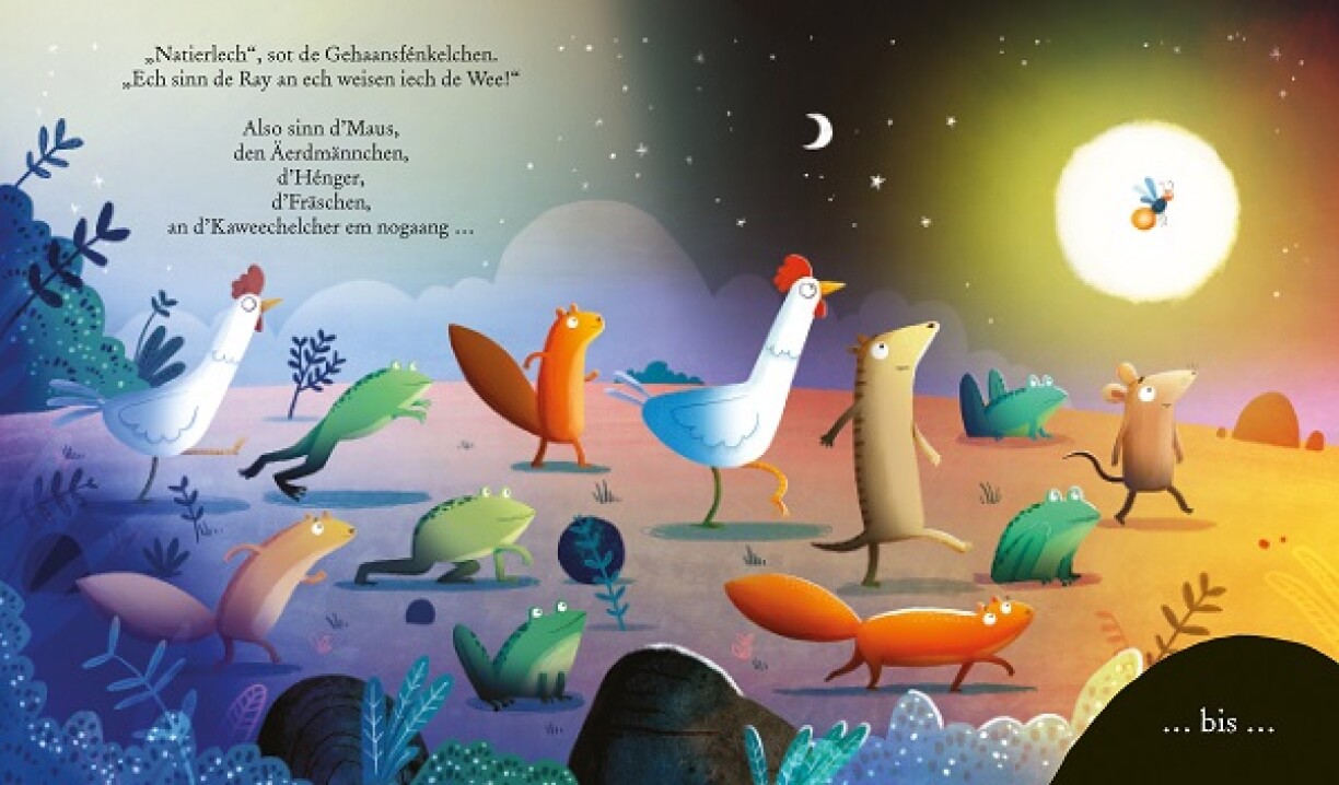 D’Maus ass op esou engem schéinen Trëppeltour, datt se guer net matkritt, wéi d’Zäit vergeet. Wéi d’Schieter méi laang ginn an et op eemol däischter gëtt, kritt se et mat der Angscht ze dinn. Ma dann daucht e Gehaansfénkelche mat sengem Liicht op. De Glüwiermche seet: »Ech sinn de Ray an ech weisen der de Wee!«