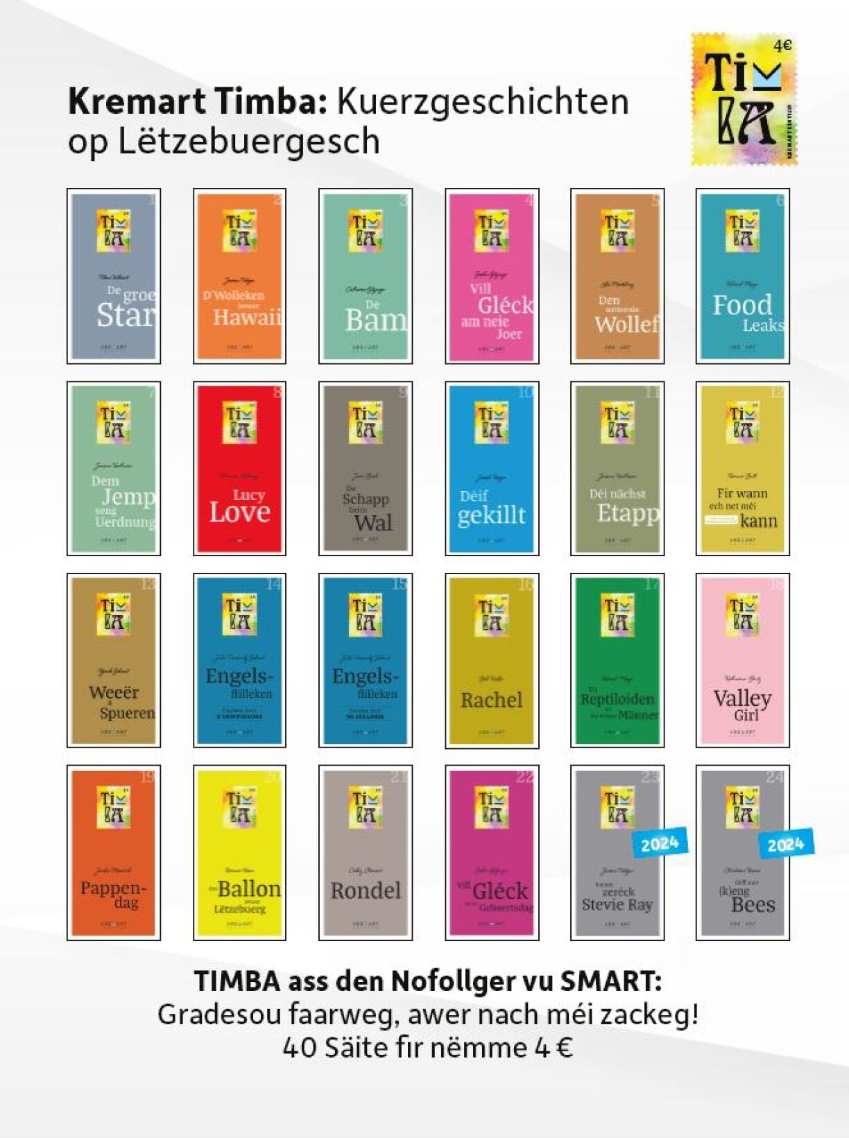 TIMBA ass den Nofollger vun der hypererfollegräicher Serie SMART a presentéiert wéi si Kuerzgeschichten op Lëtzebuergesch. Elo sinn d’Nummeren 20, 21 an 22 erauskomm. D’nächst Joer gëtt d’Serie mat den Nummeren 23 a 24 ofgeschloss.
