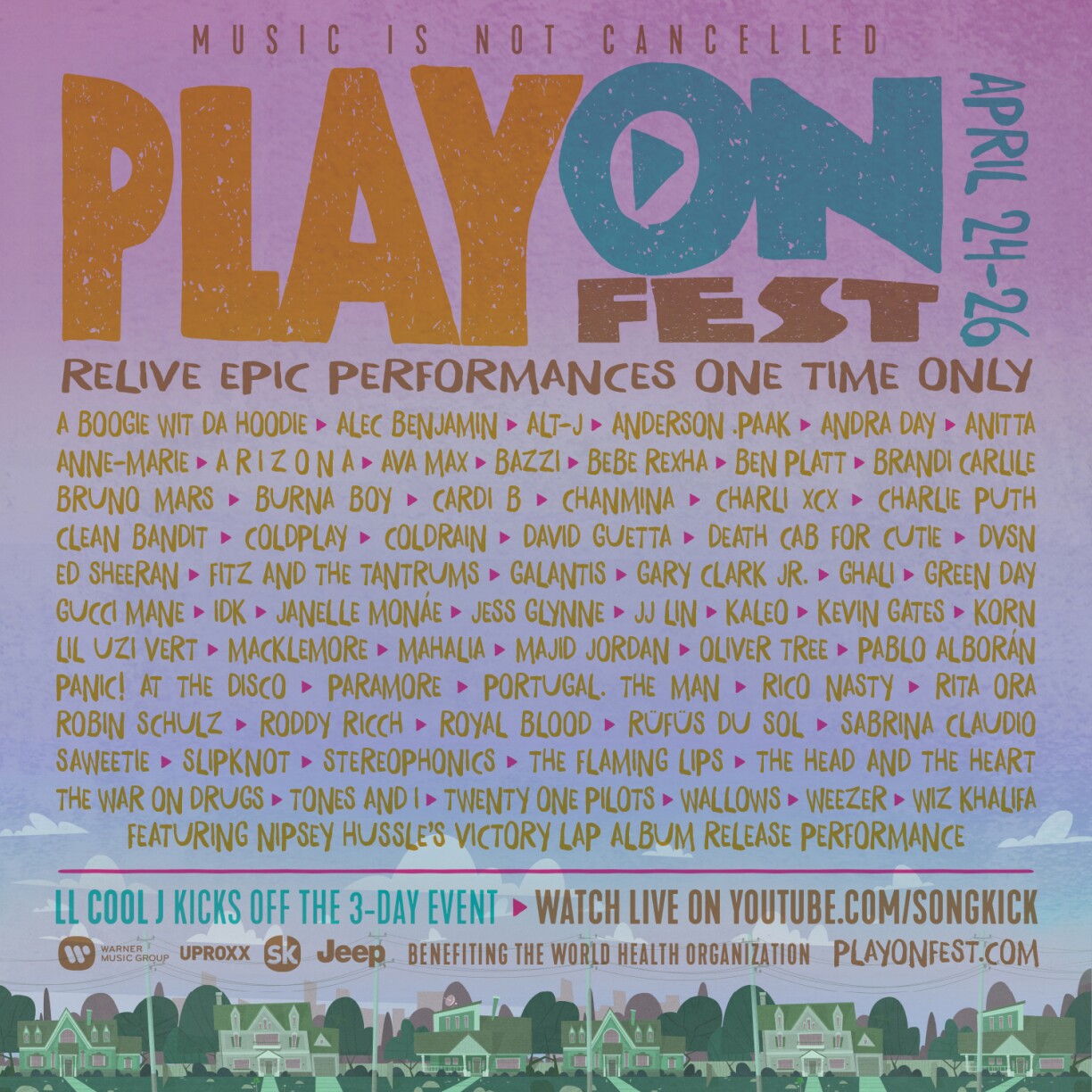 Nom grousse Succès vum Livestream-Event “One World: Together at Home”, bei deem iwwer 128 Milliounen Dollar gesammelt goufen, steet elo dat nächst Mega-Event virun der Dier. Vum 24. bis de 26. Abrëll organiséiert de Warner Music Group an d’WHO en online Festival, deen op der Youtube-Chaîne Songkick diffuséiert gëtt. 65 Kënschtler si bei dësem Evenement mat dobäi, dorënner ënnert anerem Artiste wéi Coldplay, David Guetta, Panic! at the Disco, Portugal The Man, Cardi B, Slipknot, Rita Ora, Charlie Puth, Korn, Twenty One Pilots oder Wiz Khalifa. Anescht wéi bei “One World: Together at Home” ginn hei vergaange Festival-Concerte gewisen, fir weltwäit fir gutt Laun ze suergen.