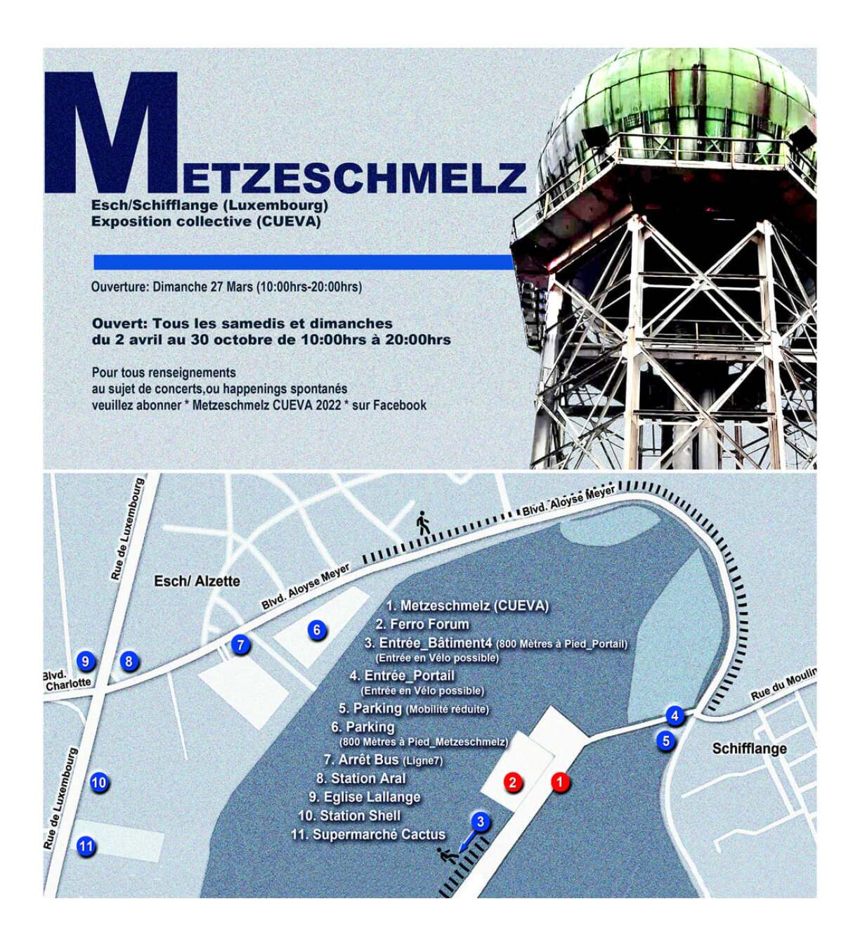 De Kënschtler Kollektiv CUEVA huet et sech déi lescht Joren zur Aufgab gemaach, verloosse Plazen ze rekrutéieren, fir op eng begrenzten Zäit eng grouss Unzuel un Artisten auszestellen. Och dëst Joer hu si nees eng besonnesch Plaz am Minett fonnt an zwar um alen Arbed Site Esch/Schëffleng, och fréier Metzeschmelz genannt. D’Iddi ass et awer och niewent der Expo eng Variatioun u Programm unzebidden: Concerten, Happenings a Projektiounen. Am Summer wäerten dann och déi eng oder aner Nocturnen dobäi kommen.