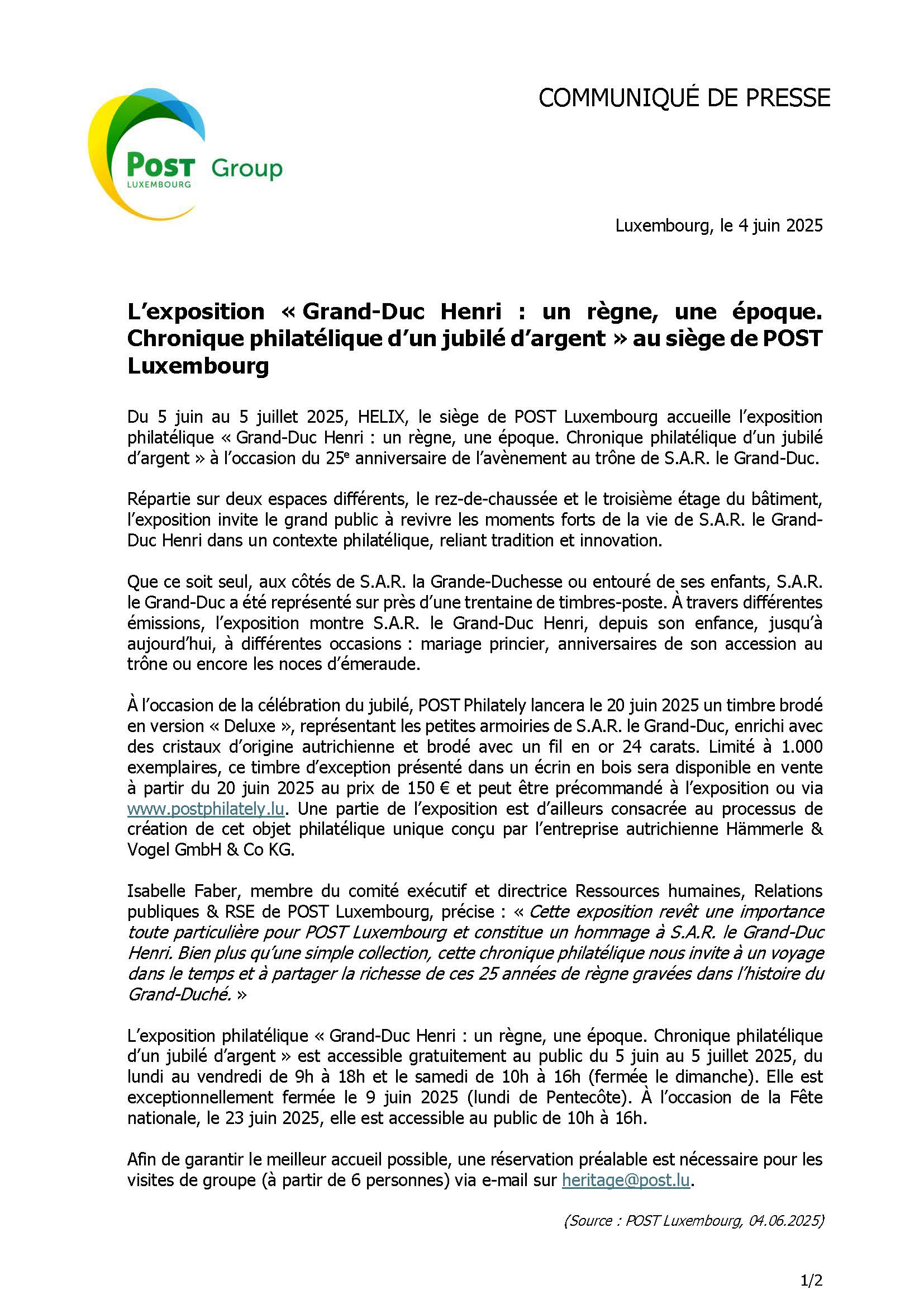 Am Siège vun der Post op der Gare, dem HELIX-Gebai, kann ee sech vum 5. Juni bis de 5. Juli d'Expo "Grand-Duc Henri: un règne, une époque. Chronique philatélique d’un jubilé d’argent" ukucken. Iwwer 30 Timbere fënnt een hei; opgedeelt op zwee Espacen um Rez-de-chaussée an um drëtte Stack am Post-Gebai. D'Timbere weisen de Grand-Duc esouwuel eleng ewéi och un der Säit vu senger Famill an an de verschiddensten Etappen an Occasioun"vu senger Herrschaft-