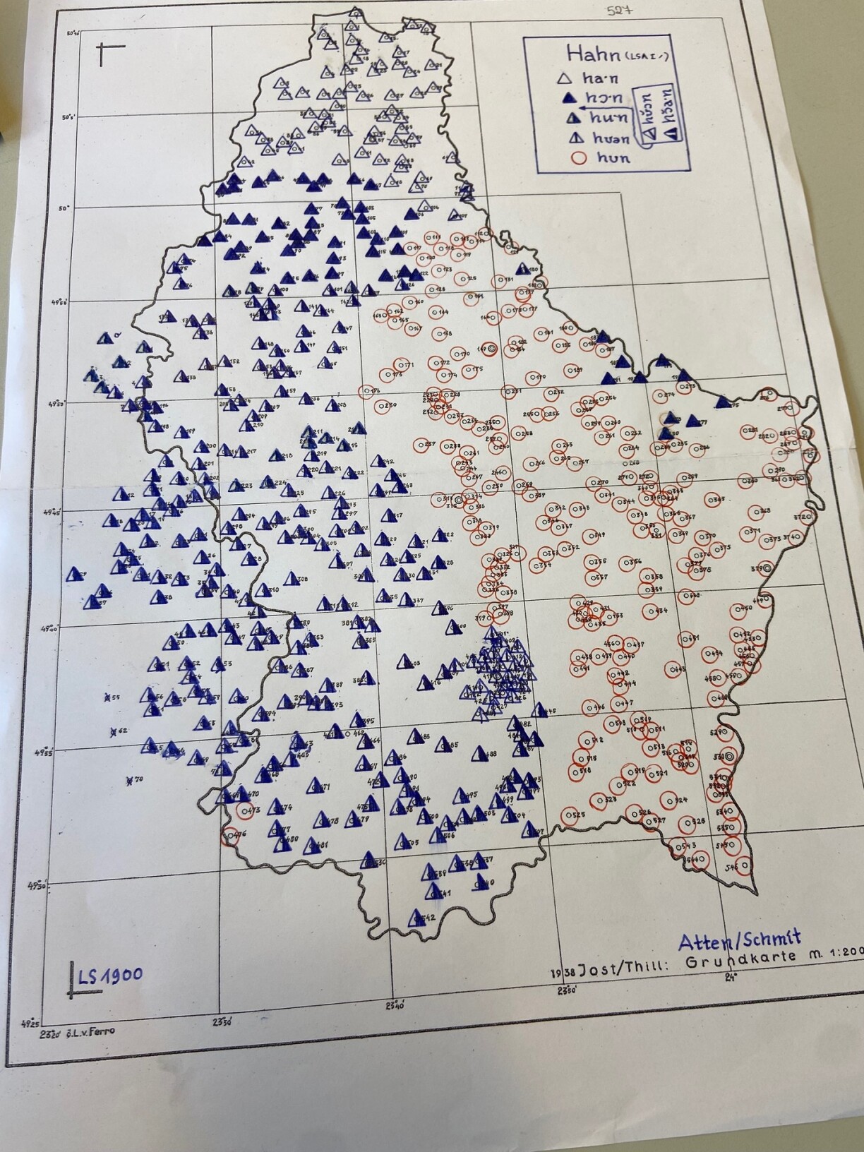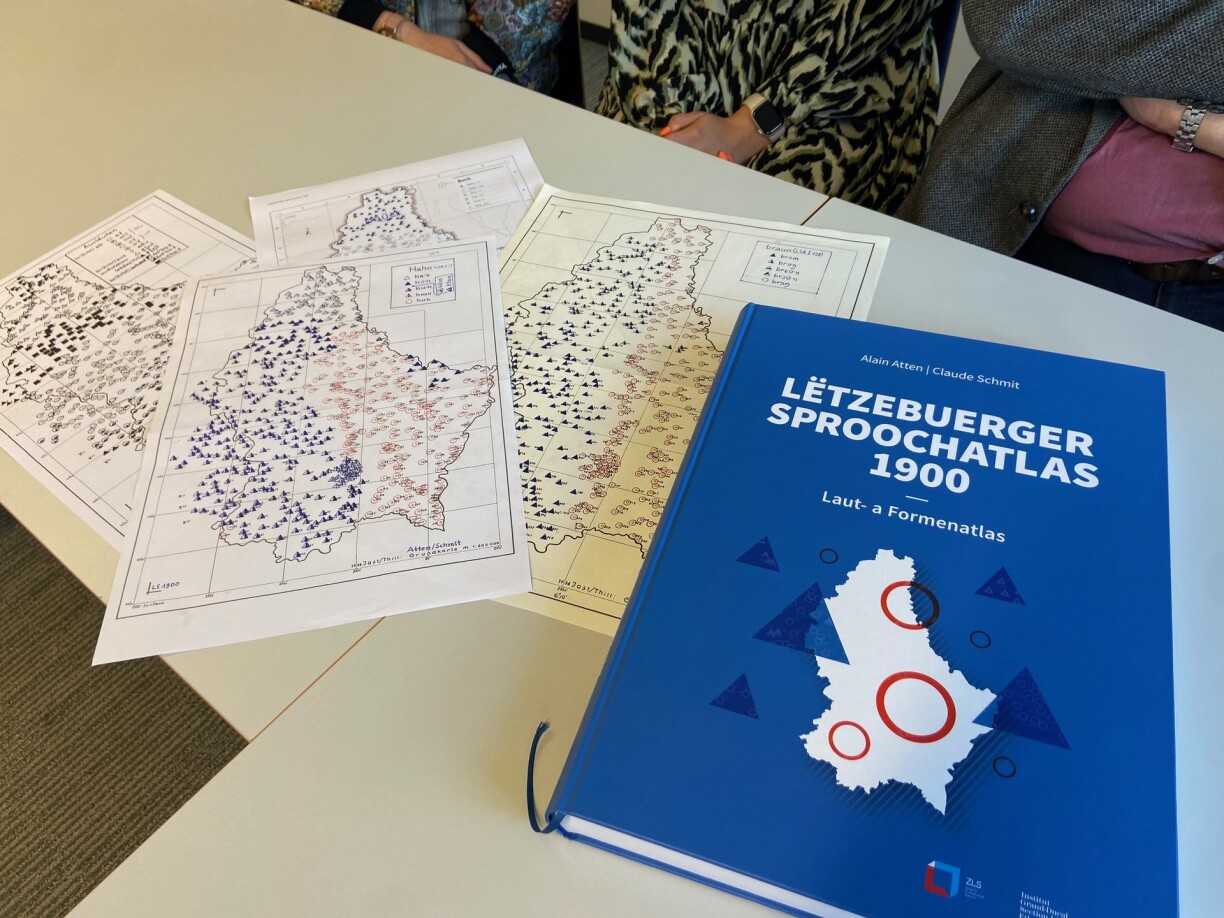 1927 ass déi éischte Kéier eng Sproochkaart zu Lëtzebuerg erauskomm. 1963 koum de Sproochatlas vum verstuerwene Professer Robert Bruch eraus. Zu deem Zäitpunkt war den Alain Atten schonn uechtert d’Land ënnerwee, fir ze notéieren, wéi verschiddenaarteg d’Leit schwätzen. 15 Joer laang huet déi Rees gedauert an elo bal 50 Joer dono, ass alles dat, wat hien deemools festgehalen huet, am “Lëtzbuerger Sproochatlas 1900" ze fannen: 618 Plazen, 600 Kaarten, 40 Symboler, 197.000 Zeechen, eng Véierelsmillioun handgemoolte rout Rondelen a blo Dräiecker, 4,5 Kilo schwéier.