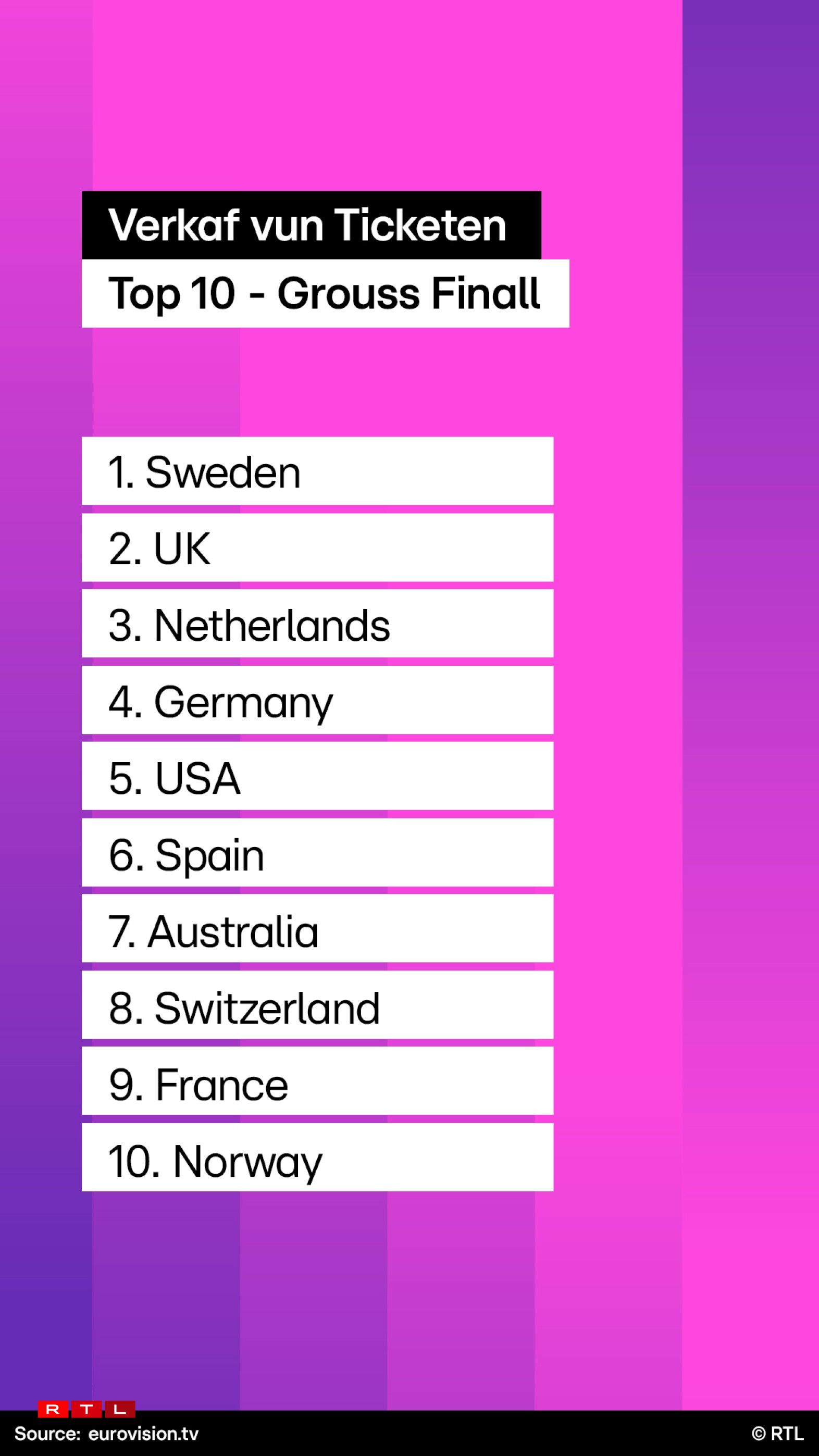 Wat nach opfält, och an den USA ass den Eurovision immens beléift. Do mécht d’Vente 5,5 Prozent vum kompletten Ticketsverkaf aus, 50 Prozent sinn et souguer bei der net-europäescher Ticketsvente.