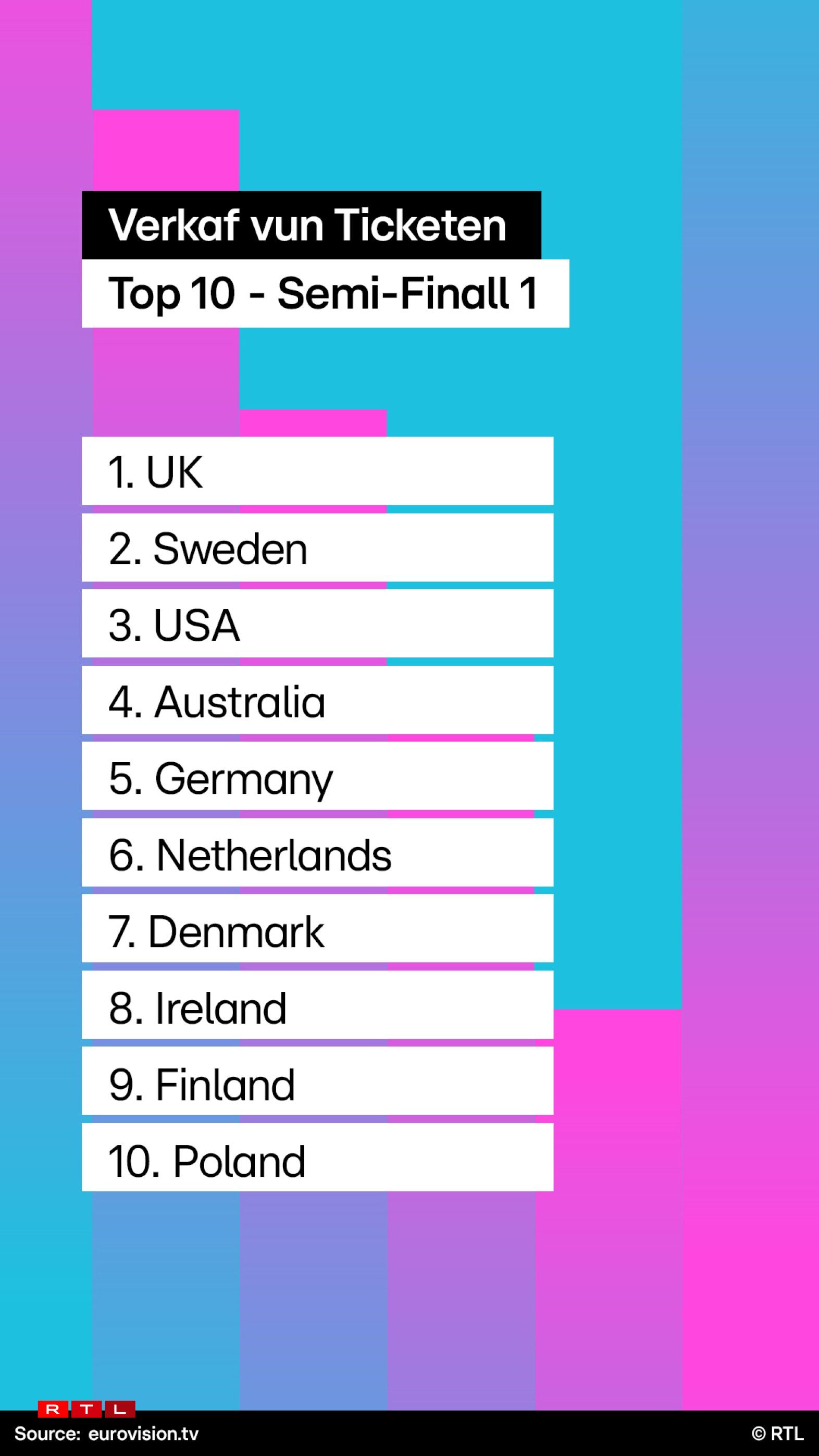 66,5 Prozent vun de Persounen, déi sech en Ticket bestallt hunn, sinn Auslänner, déi aner 33,5 Prozent kommen aus der Host-Stad Malmö. Spëtzereider an der Ticketsvente bleift awer Groussbritannien, d’lescht Joer jo en plus Host-Land fir d’Ukrain. D’Vereenegt Kinnekräich läit mat bal engem Fënneftel vun der kompletter Vente (18%) op Plaz 1.
