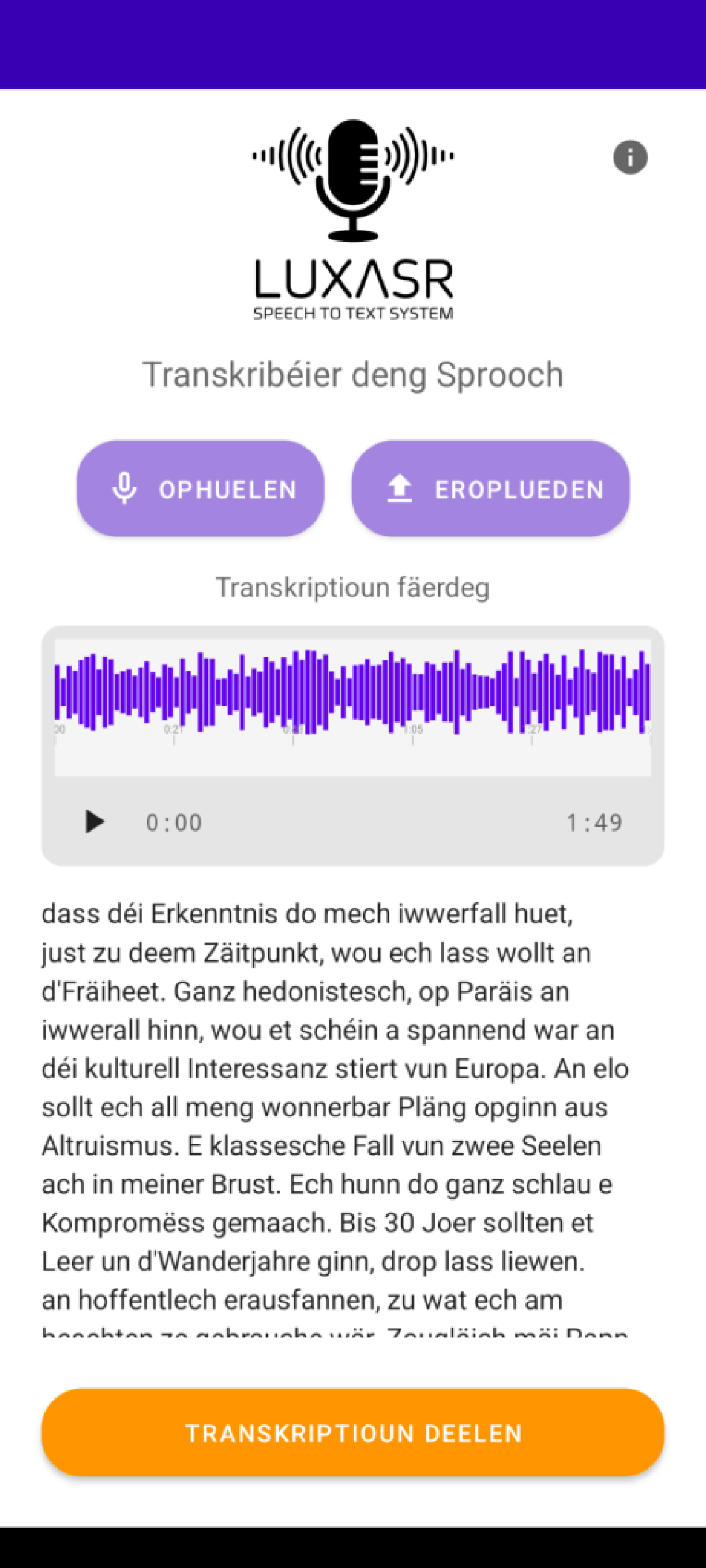 “Wärend de Webinterface vu LuxASR eng Rëtsch vu weidere Funktiounen huet, ass d’LuxASR-App éischter dofir geduecht, séier an ouni vill Geklicks en Audio an den Text ëmzewandelen”, heescht et um Internetsite Infolux vum Uni-Institut. A weider: “Egal ob Dir ënnerwee séier eng Notiz diktéieren, en Interview oder e Video transkribéieren oder eng Sproochnoriicht an Textform brénge wëllt – LuxASR hëlleft Iech.”