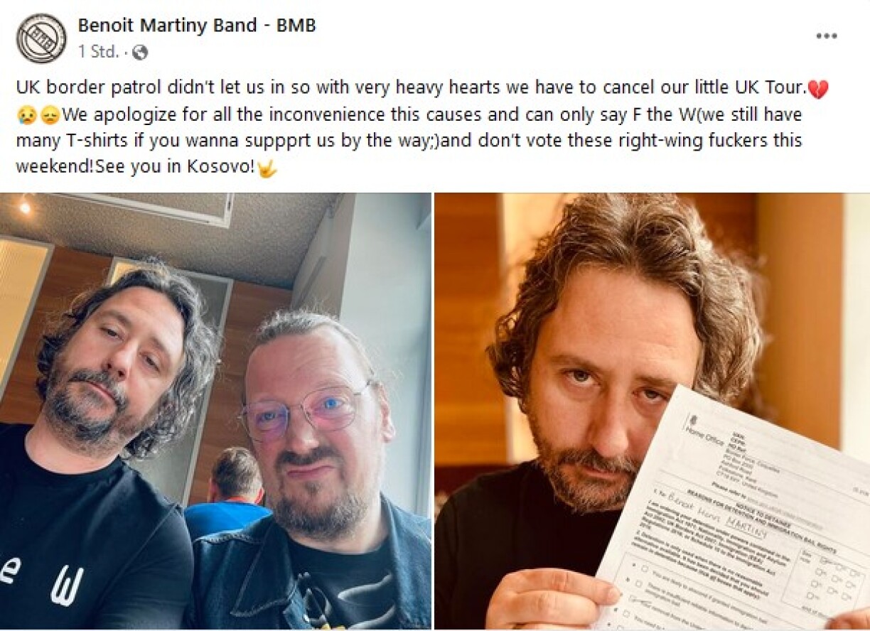 De Benoit Martiny: “Wat ech dann awer warscheinlech e bëssen iwwerlies hunn, ass, datt een eng Invitatioun brauch, iergendwéi eng offiziell Invitatioun. An ech hate jo Beweiser, E-Mail-Kontakter, Poustere vum Festival, dee mer sollte spillen an England, an esou weider. An do war eben mäi Feeler, dat ech geduecht hunn, dat geet duer, an datt ech och wedervun de Venues nach vu soss Iergendengem am Fong gesot krut, wat ech genau bréicht.”